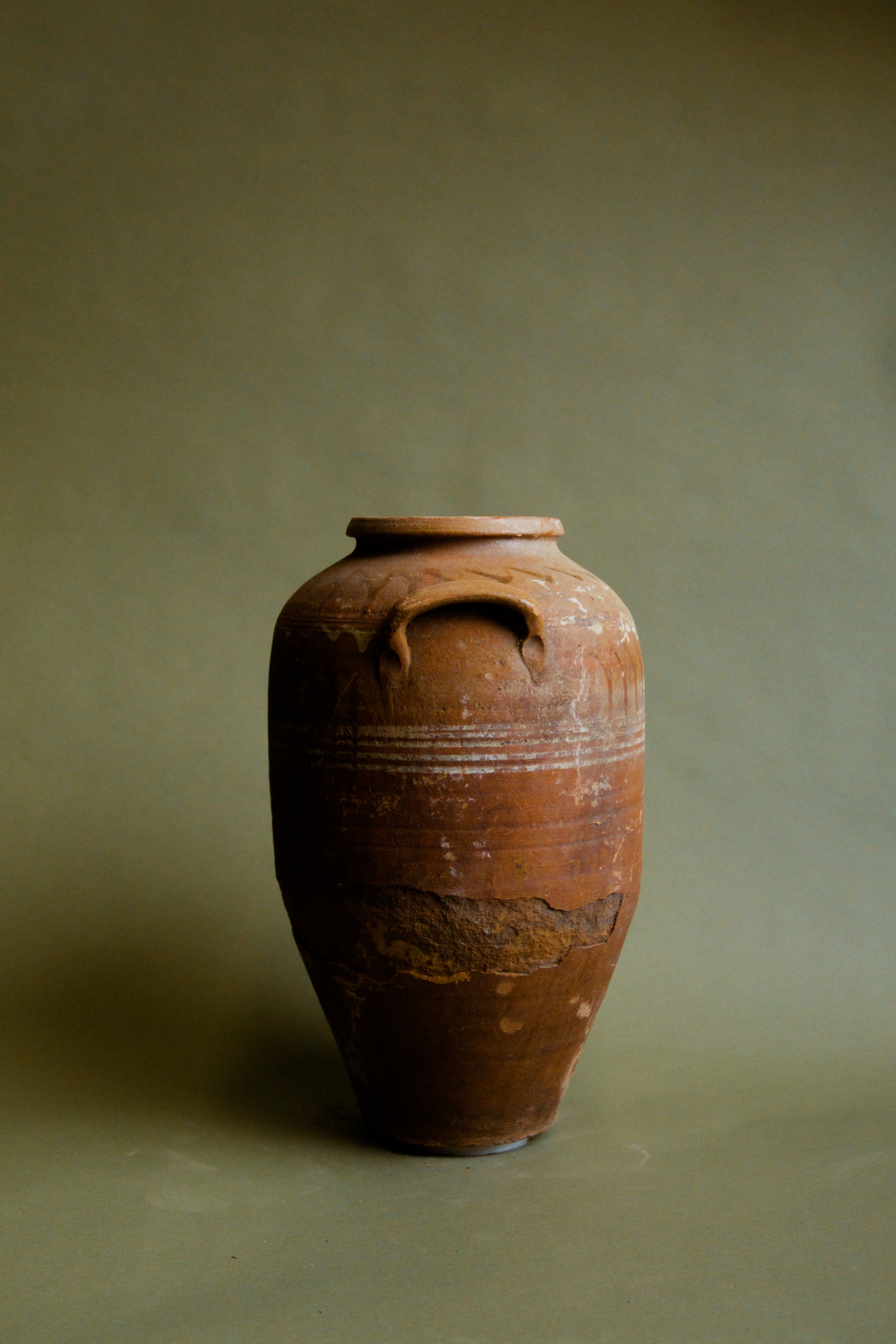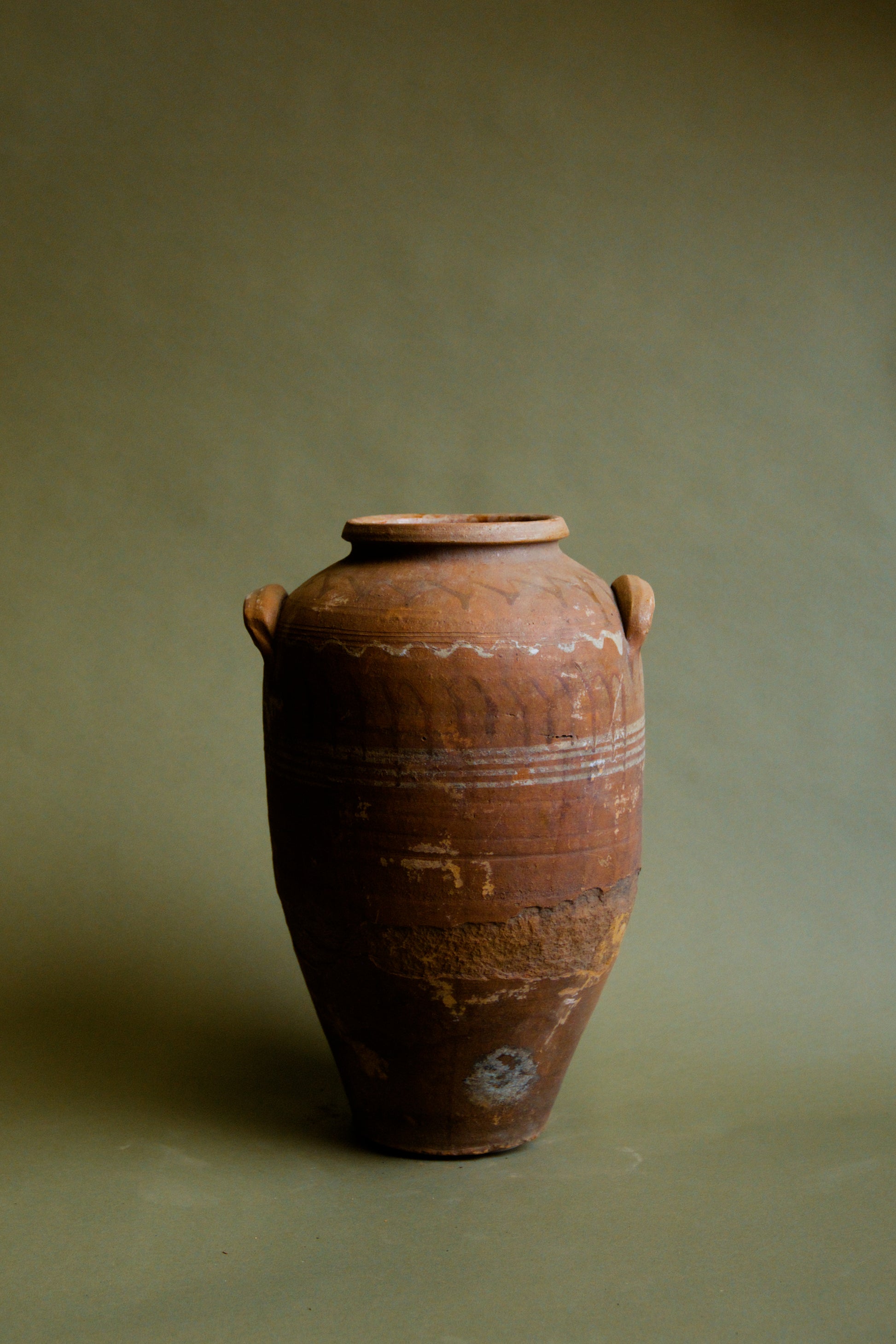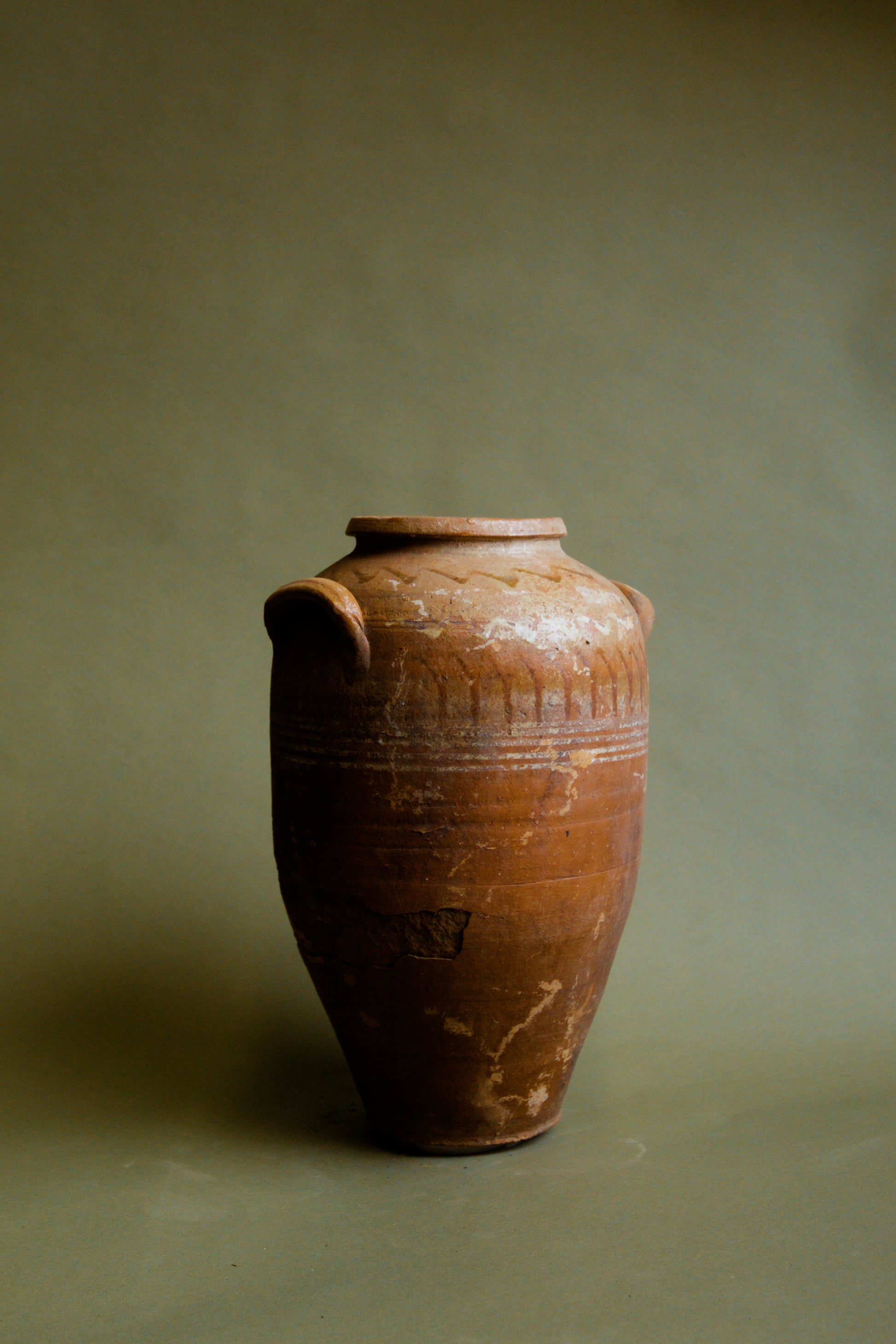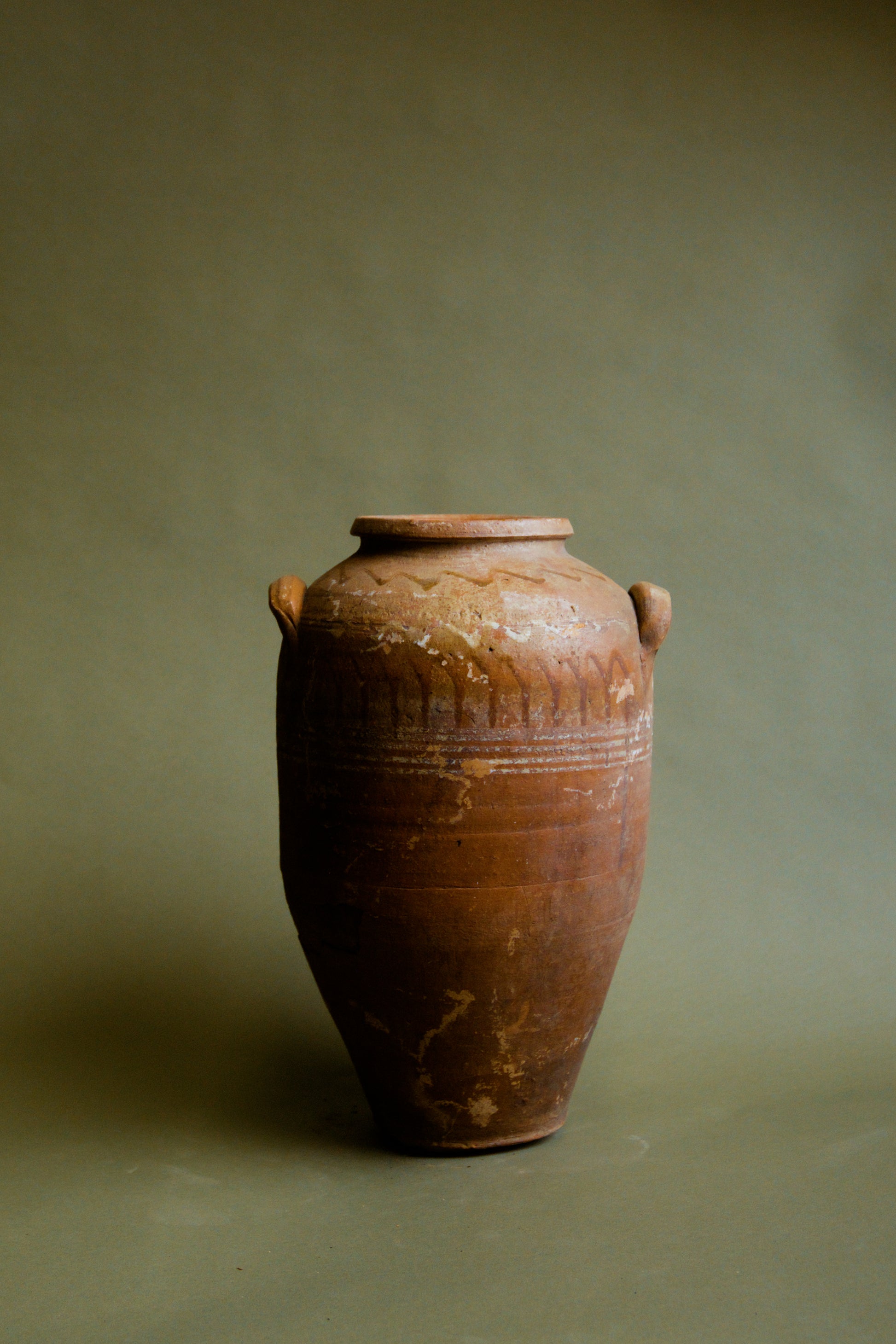 This handcrafted Anatolian terracotta jar, used traditionally for grain storage, showcases intricate hand-etched designs that celebrate Turkish pottery heritage. Its natural, warm terracotta tone is enhanced by decorative bands and patterns, giving the jar a distinctive, rustic charm. Fired for durability, this clay vessel brings authentic, vintage character with unique weathered textures and natural imperfections.