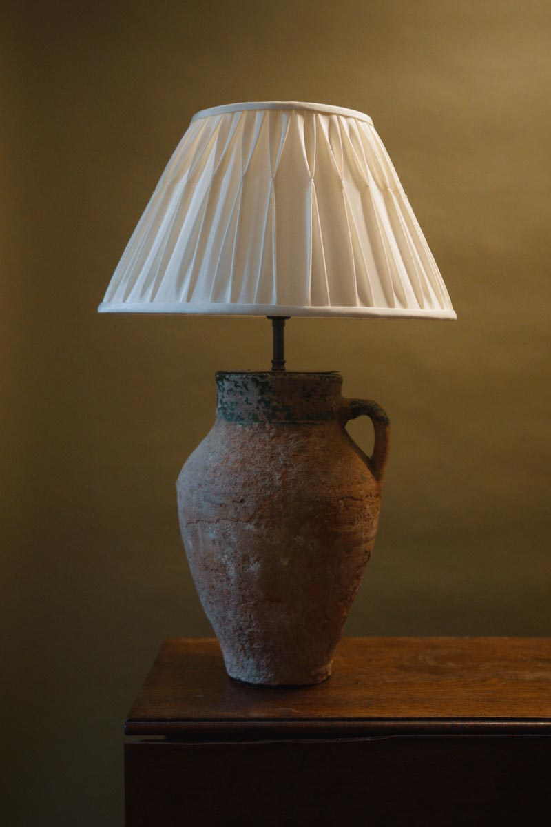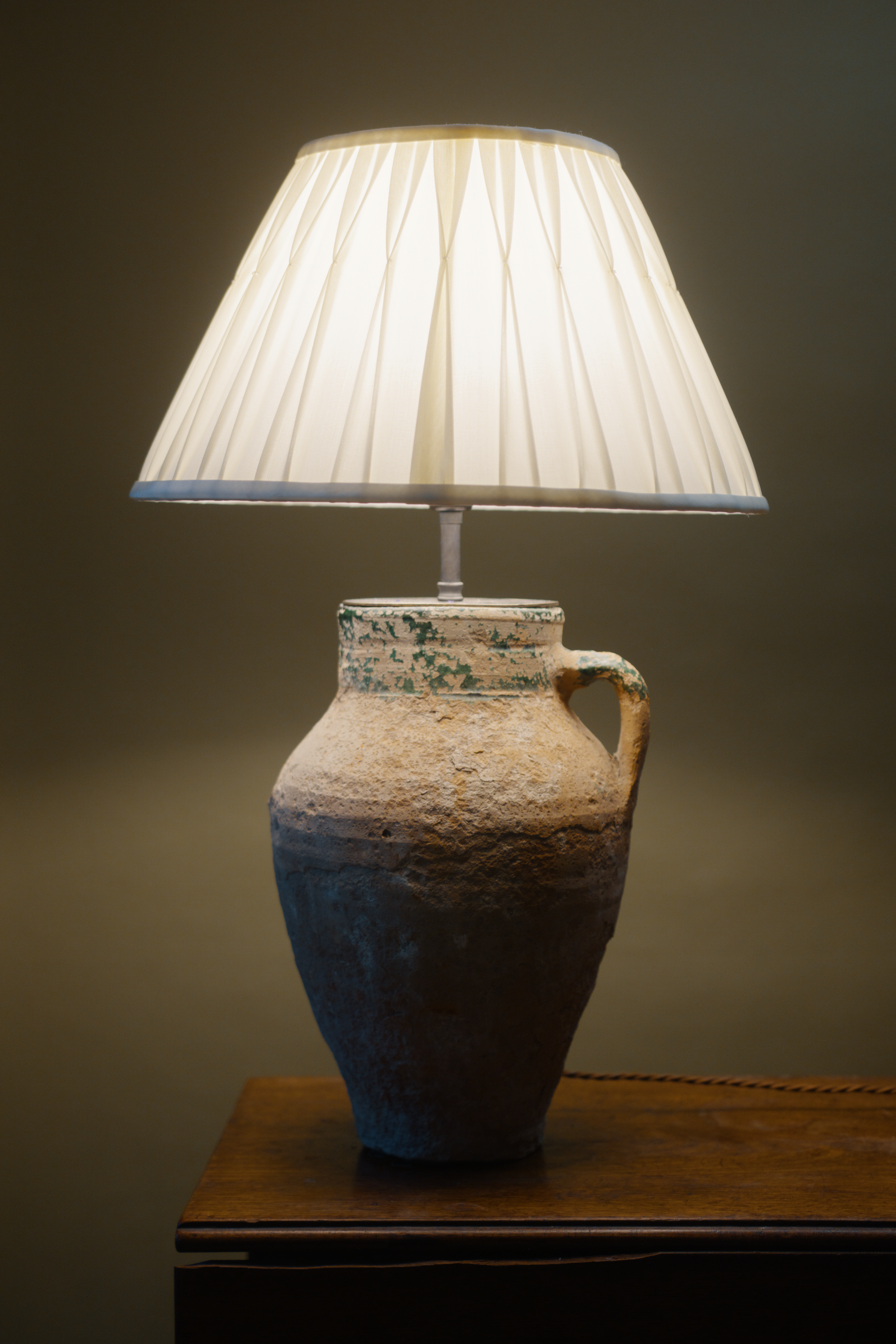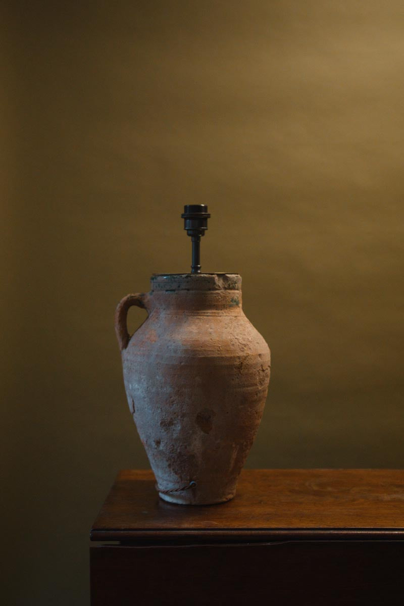 Handcrafted in Turkey’s Southern Anatolian region using locally sourced clay, this pot features a weathered surface and traces of green glazing. Once used for everyday storage, it has now been expertly converted in the UK into a functional table lamp. The patina and wear, including the missing handle, give it a storied and lived-in feel, making each piece truly one-of-a-kind.