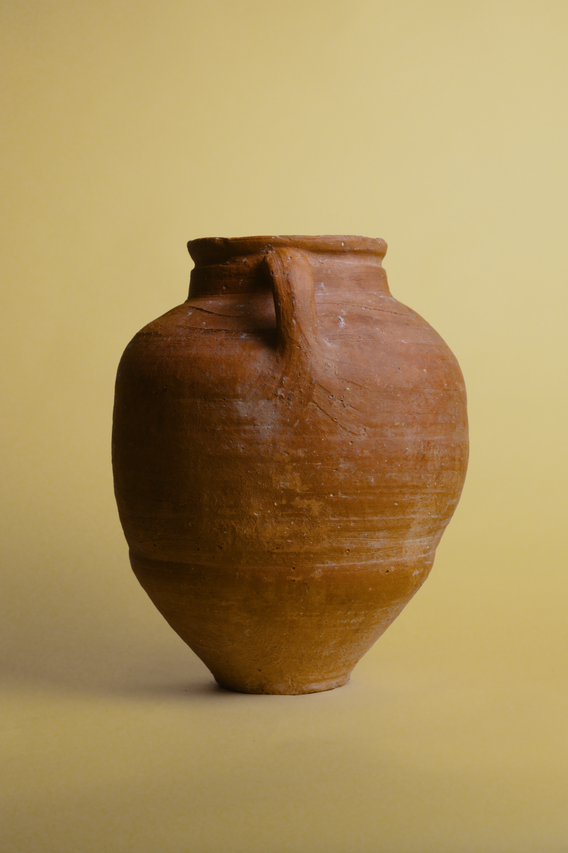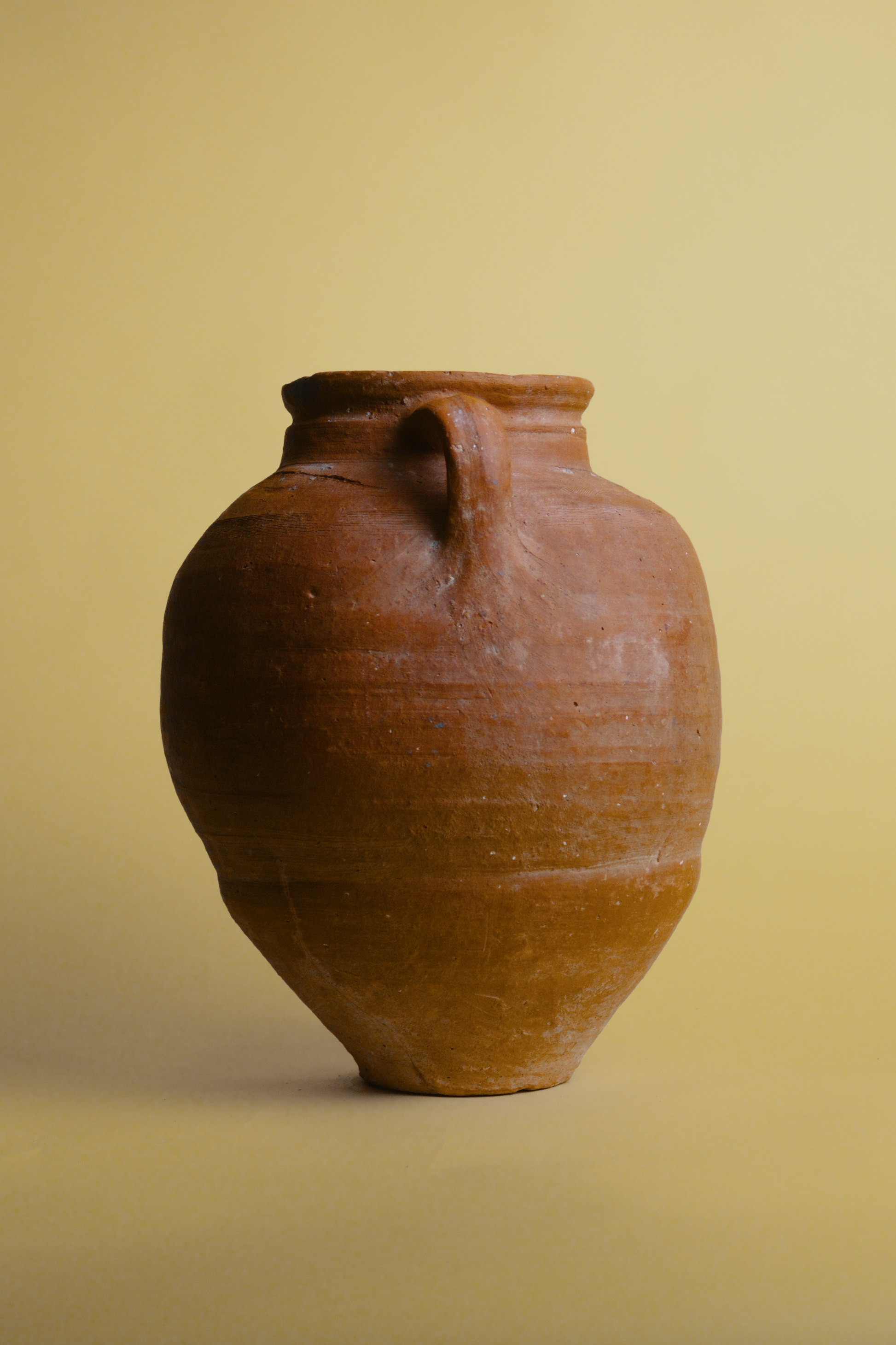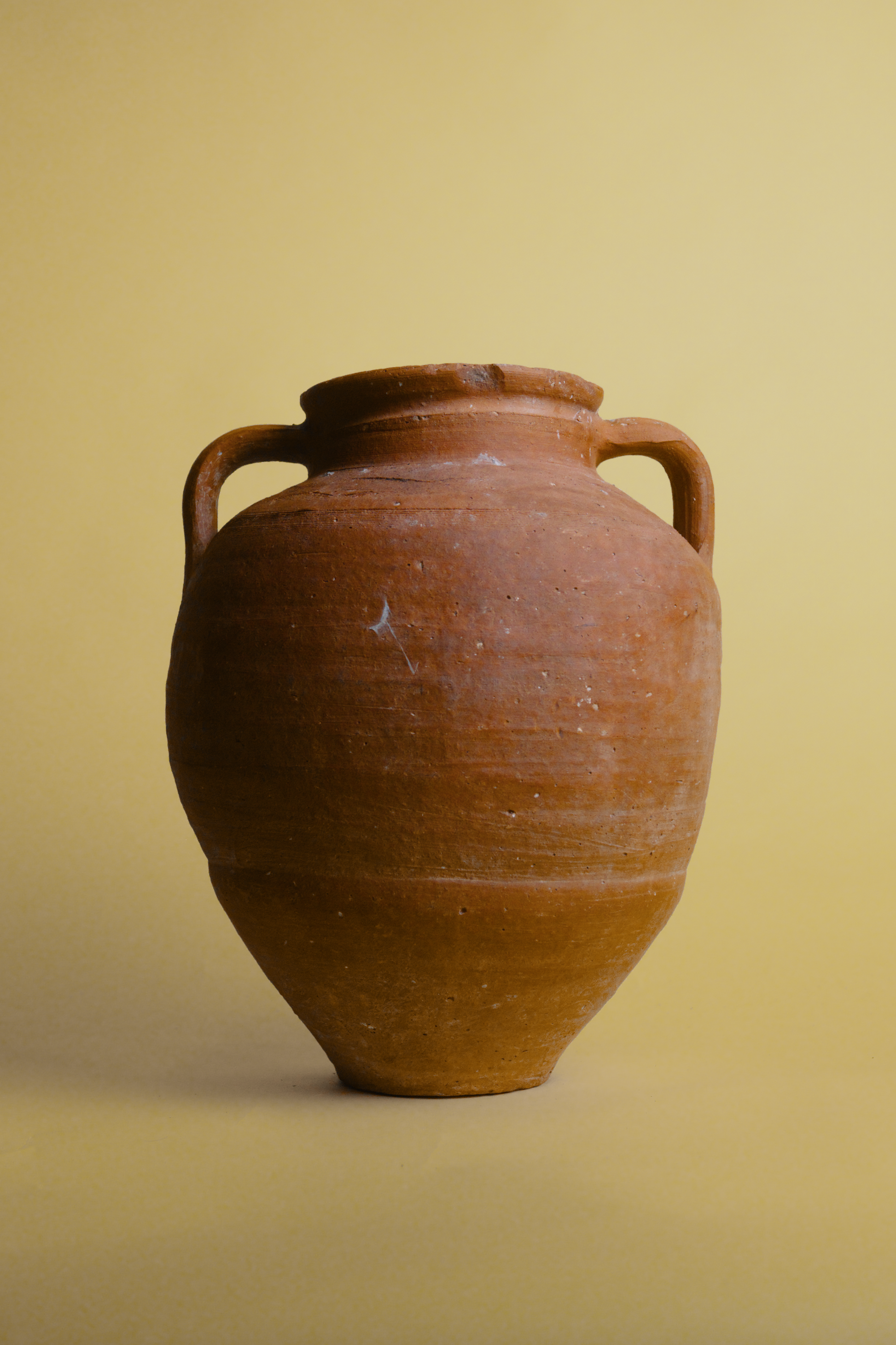 This antique clay pot from Anatolia, Turkey, was crafted for storing grains and essentials. Its wide-bodied shape, double handles, and warm terracotta finish embody the timeless practicality of Anatolian pottery.