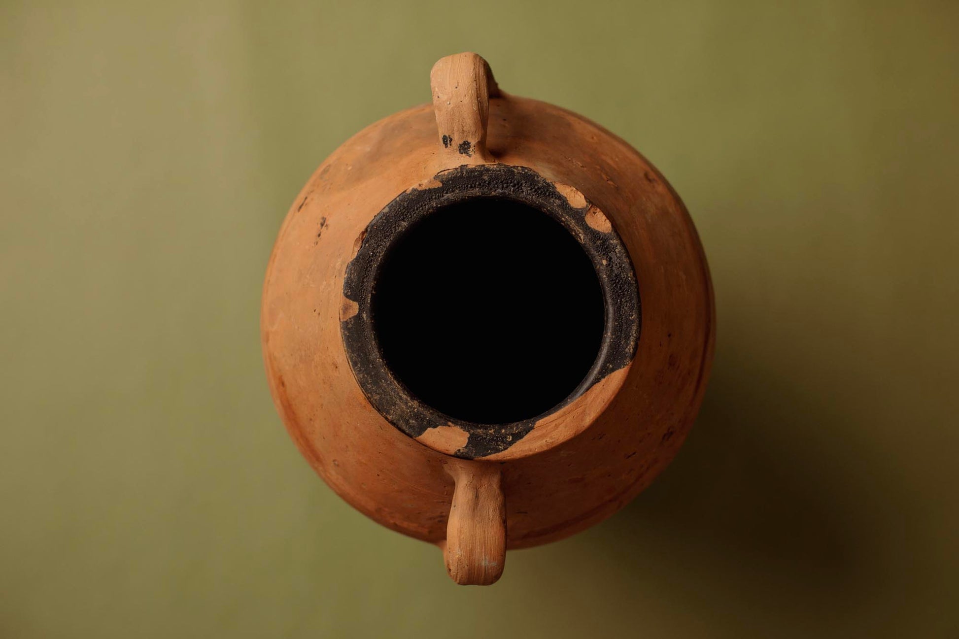 This antique olive jar originates from western Anatolia, where it once held olives and oil. The rim has darkened over time from repeated use and sealing, leaving a distinctive blackened edge against the warm clay. Its tall, tapering form and rounded shoulders were made for balance and easy transport, while the surface shows the gentle marks of firing and handling — proof of a life well used.