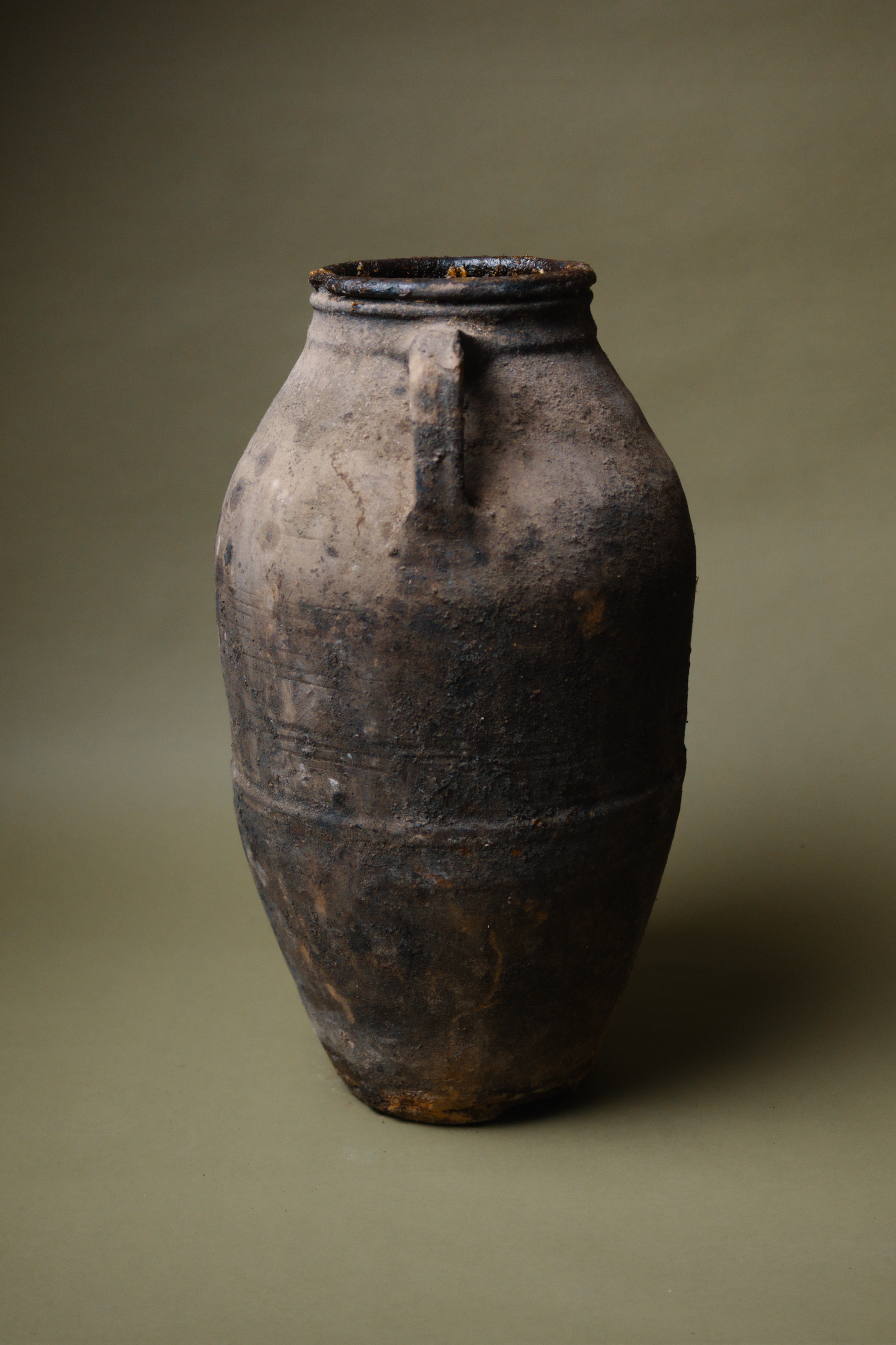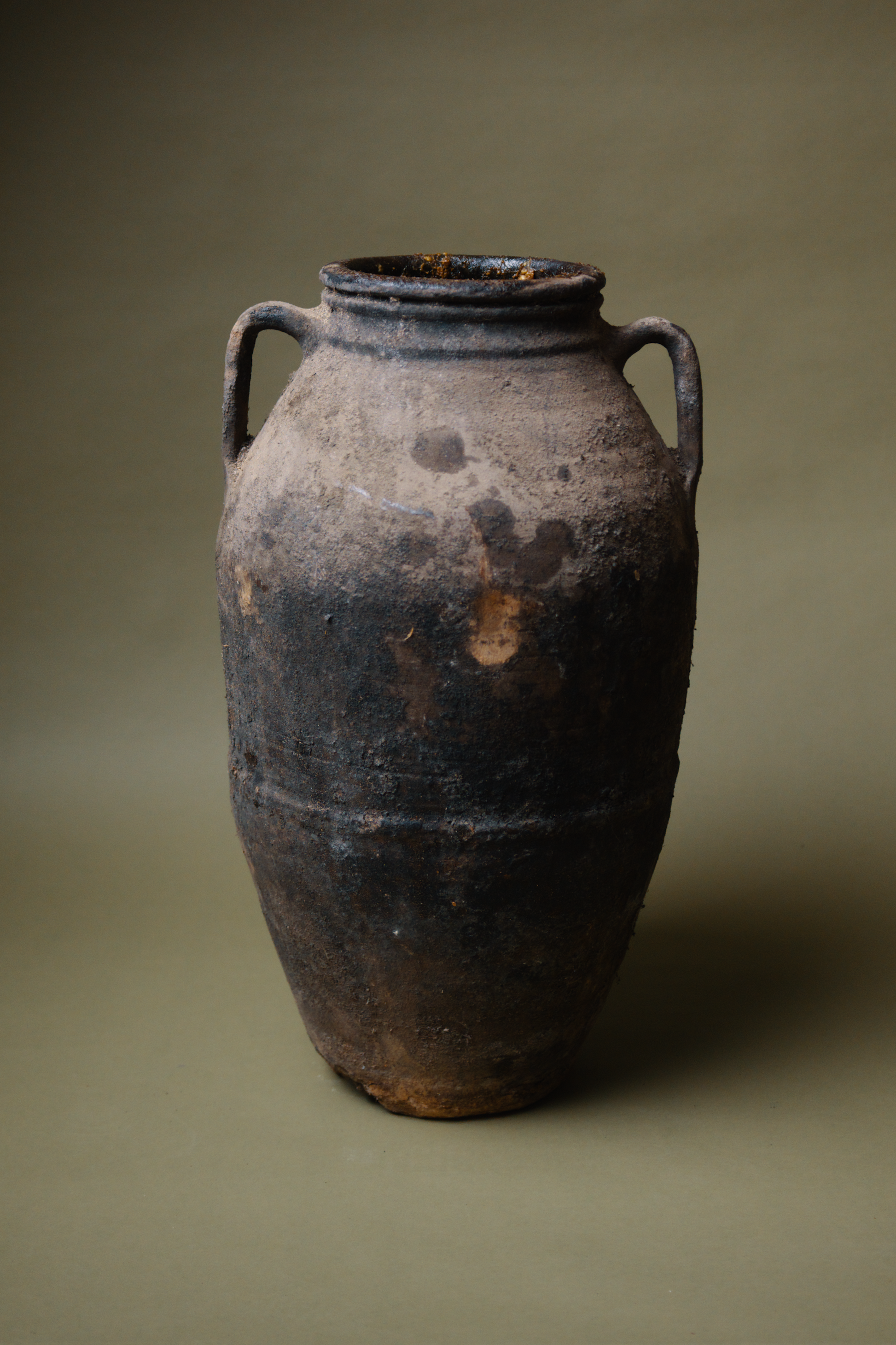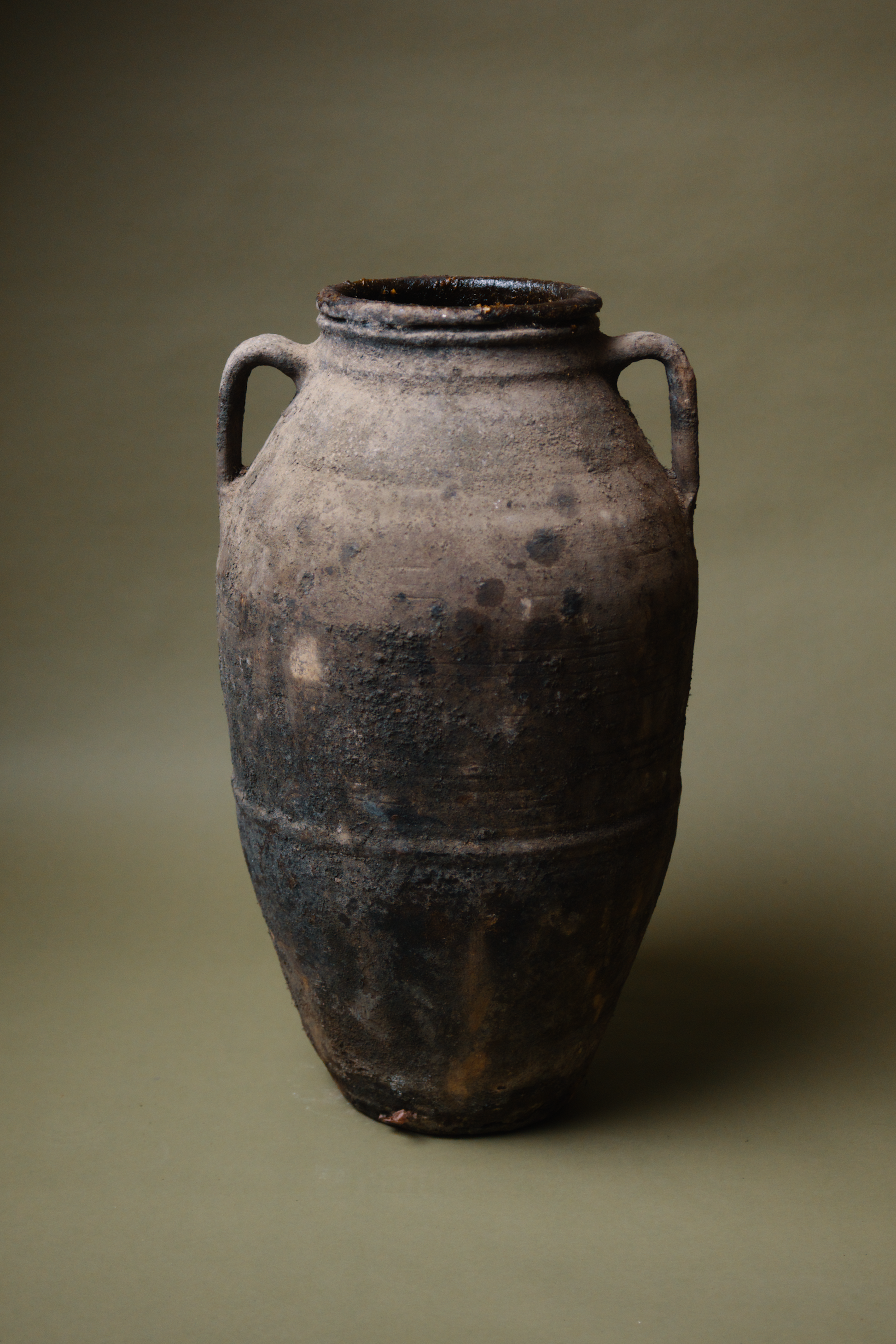 This striking blackened Turkish amphora exudes history and character with its textured surface and two sturdy handles. Traditionally used for storing oils or grains, it reflects the utilitarian craftsmanship of Anatolian pottery. The dark, rustic finish is a result of years of use, giving the vessel a unique patina that enhances its authenticity. Perfect as a decorative piece, this amphora adds depth to interiors inspired by cottagecore, farmhouse, or Mediterranean aesthetics. Its commanding presence makes it ideal for entryways or as a centrepiece in a living space.