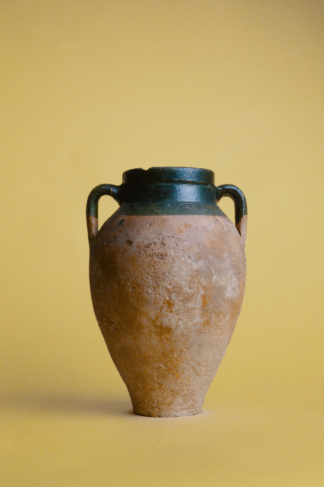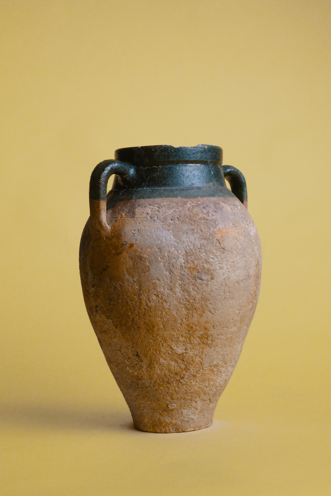 This antique amphora, distinguished by its striking dark green rim and dual handles, embodies the rustic beauty of traditional craftsmanship. Its earthy clay tones and rugged texture lend it a timeworn charm, while the green accent adds a touch of character. Perfect for farmhouse or country-style interiors, this piece once used for storage brings a sense of history and authenticity to any setting.