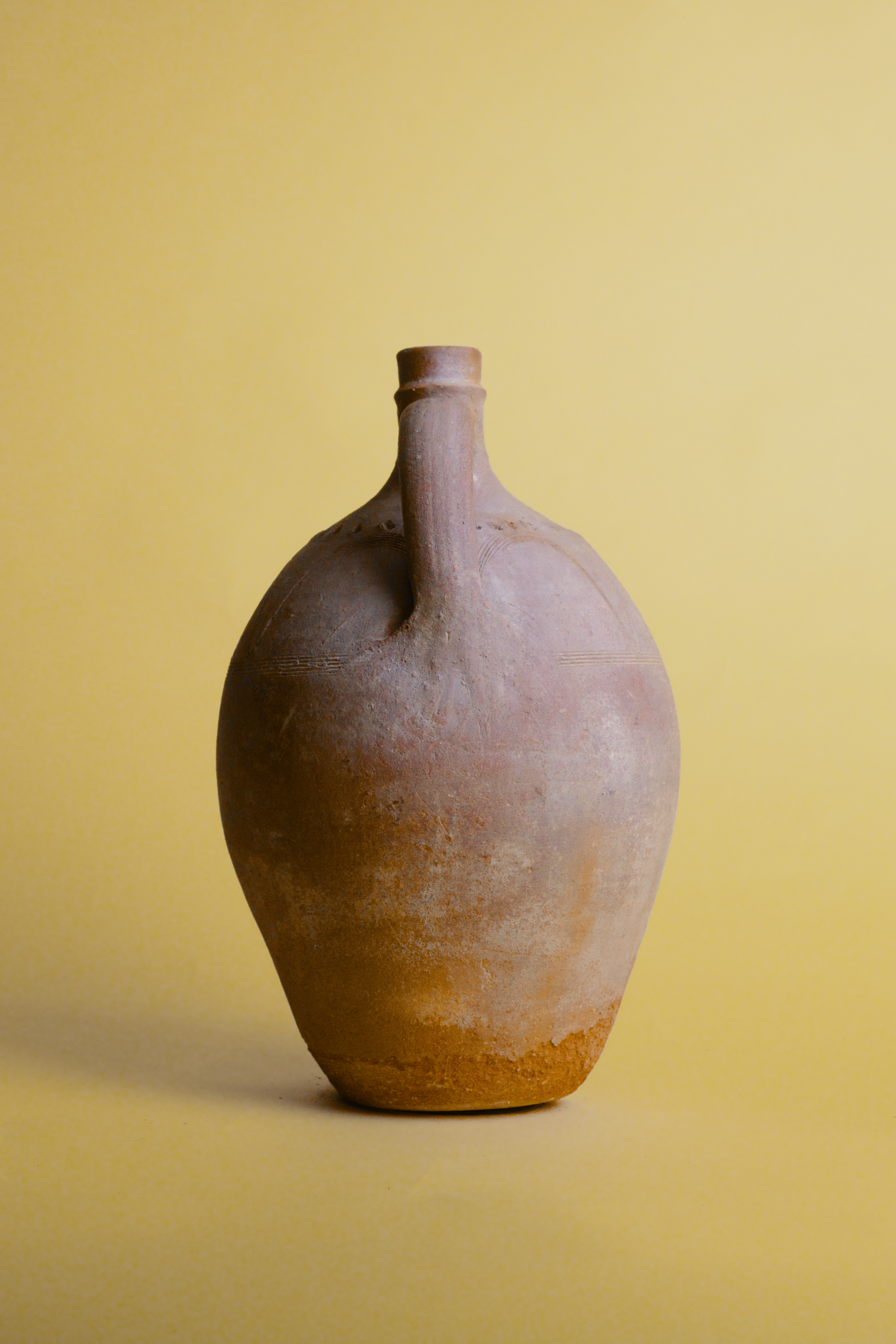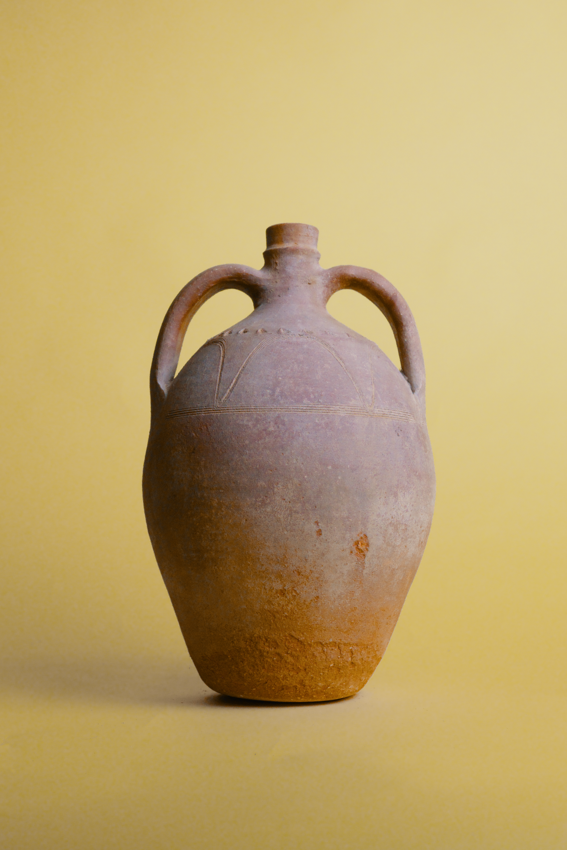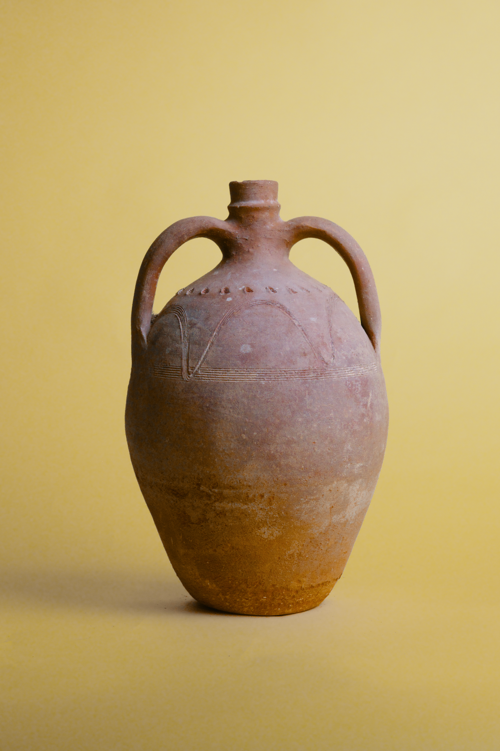This vintage Mediterranean amphora, featuring dual handles and a classic terracotta form, embodies the character of ancient pottery. The piece’s warm, earthy tones and subtle engravings showcase the charm of traditional craftsmanship. Once used for storing essential goods, this amphora now brings rustic history and warmth to any decor.