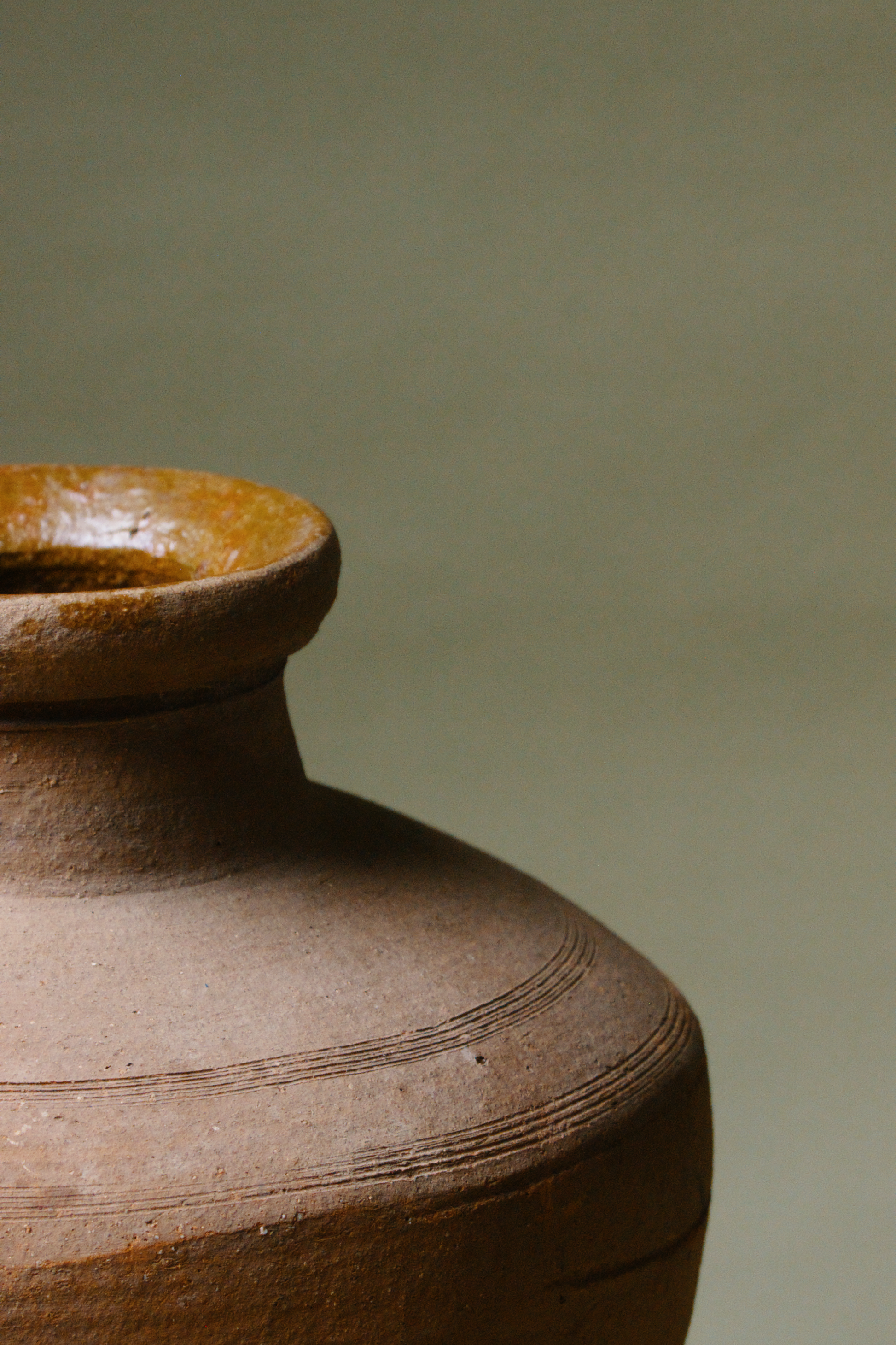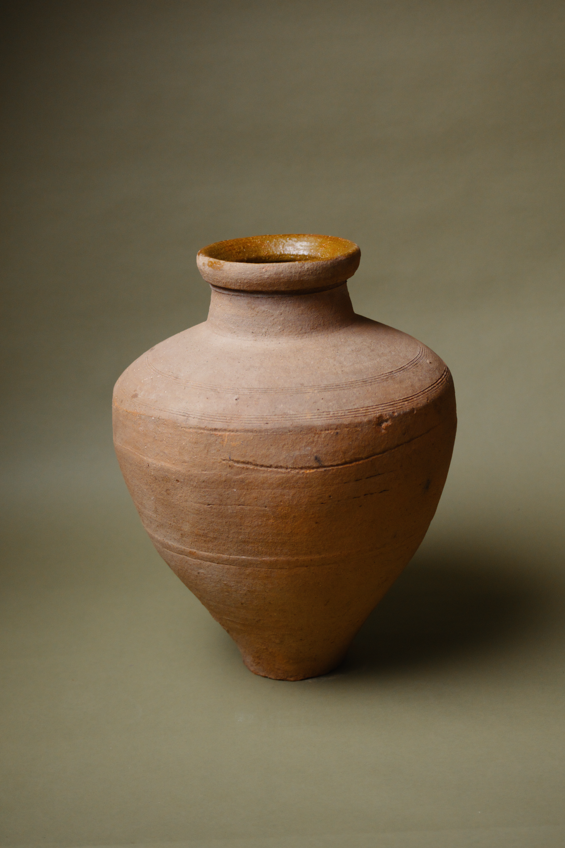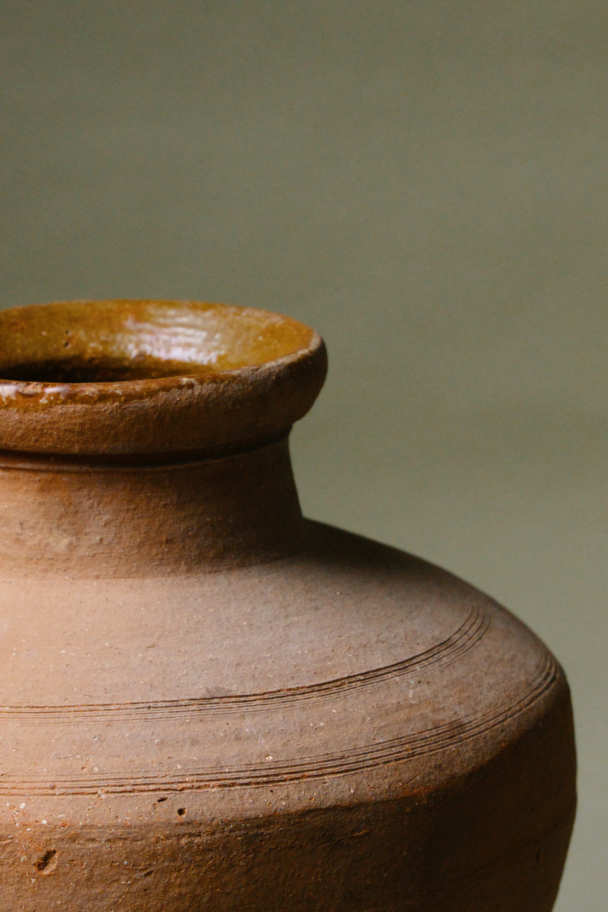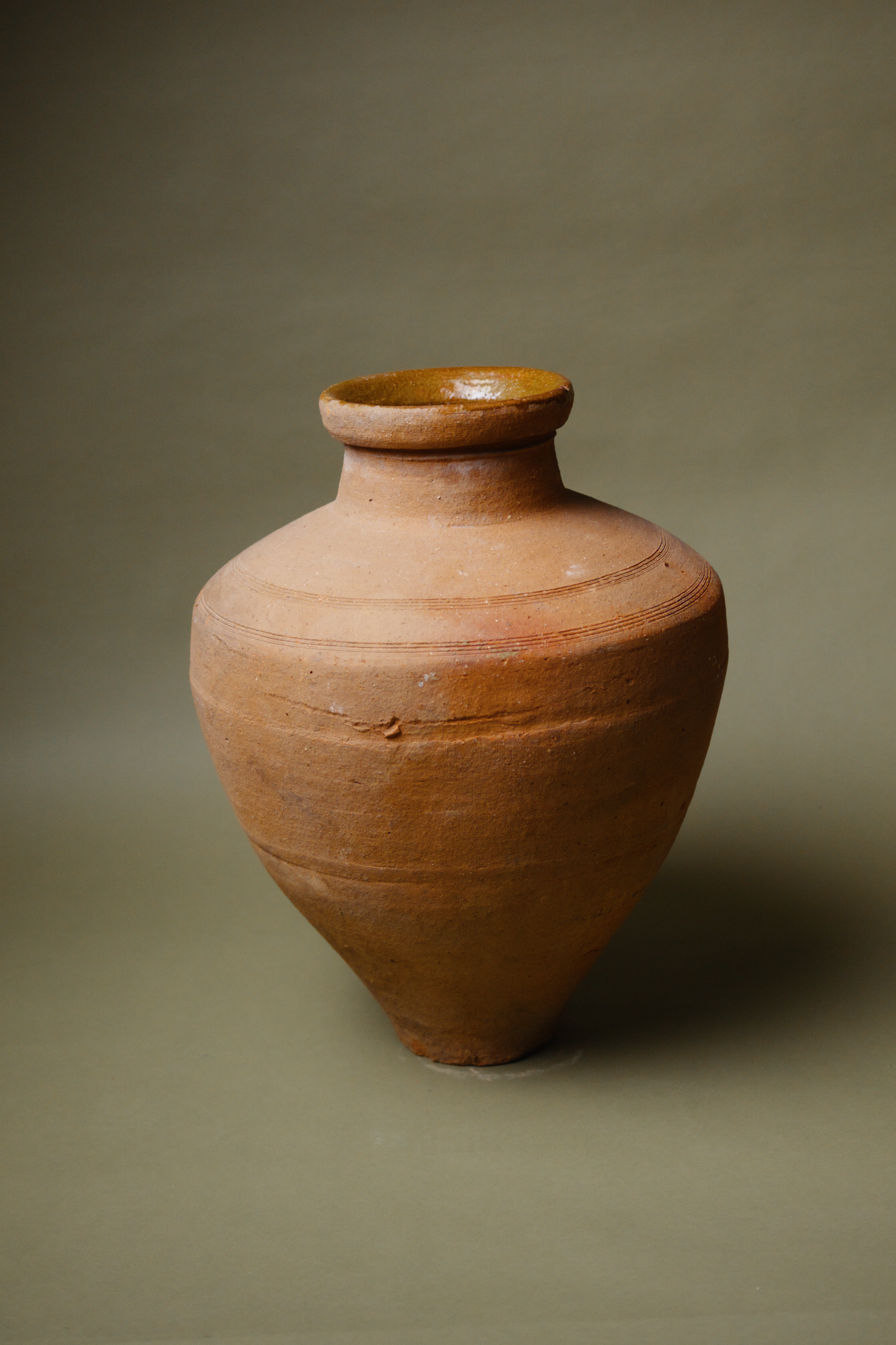 This vintage terracotta storage pot from the early 20th century was crafted for holding grains or water. Its earthy terracotta body is enhanced by a unique glazed rim, adding a subtle touch of character to its utilitarian form. Natural ageing and weathered imperfections highlight its past, making it an authentic addition to farmhouse or country-style decor.