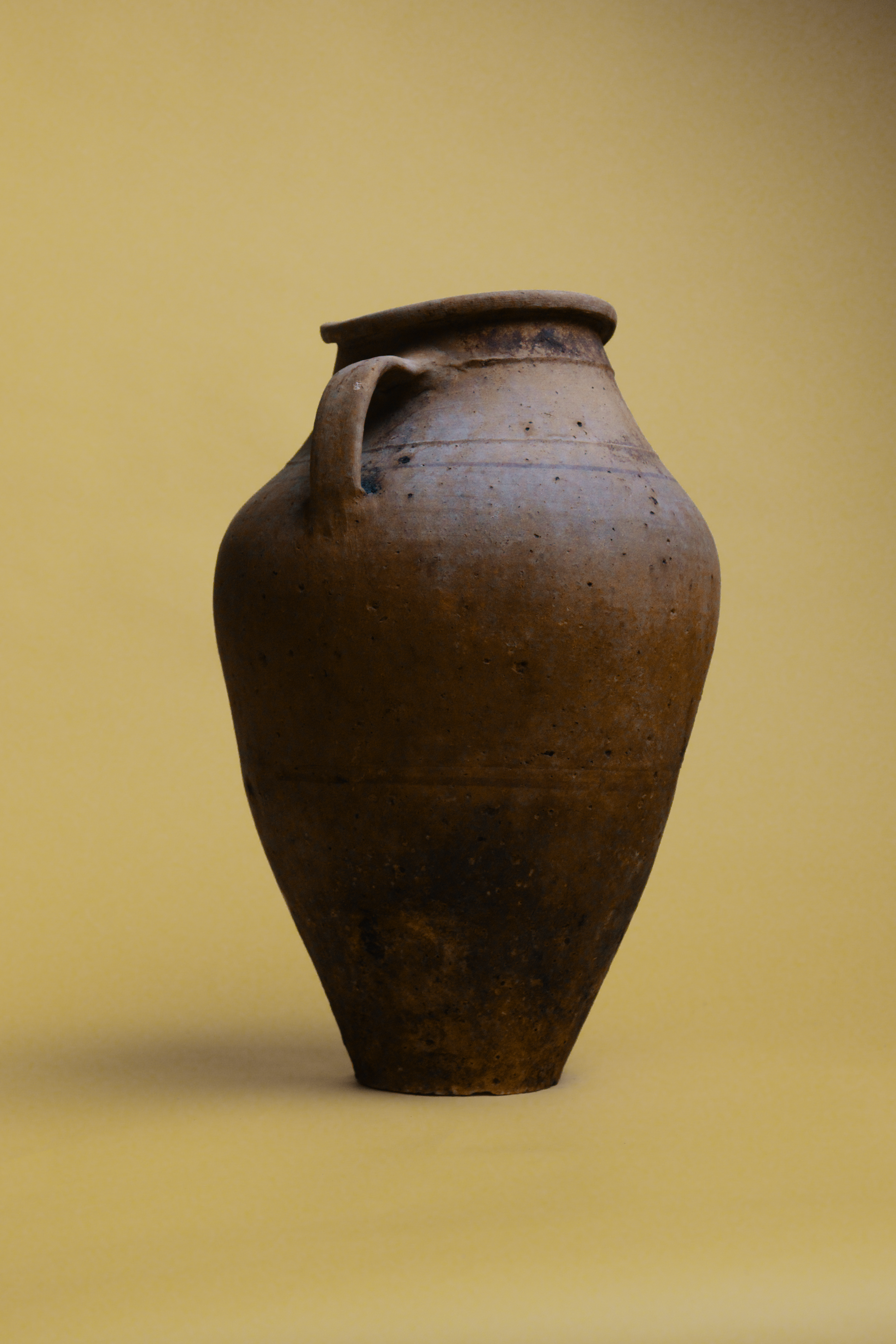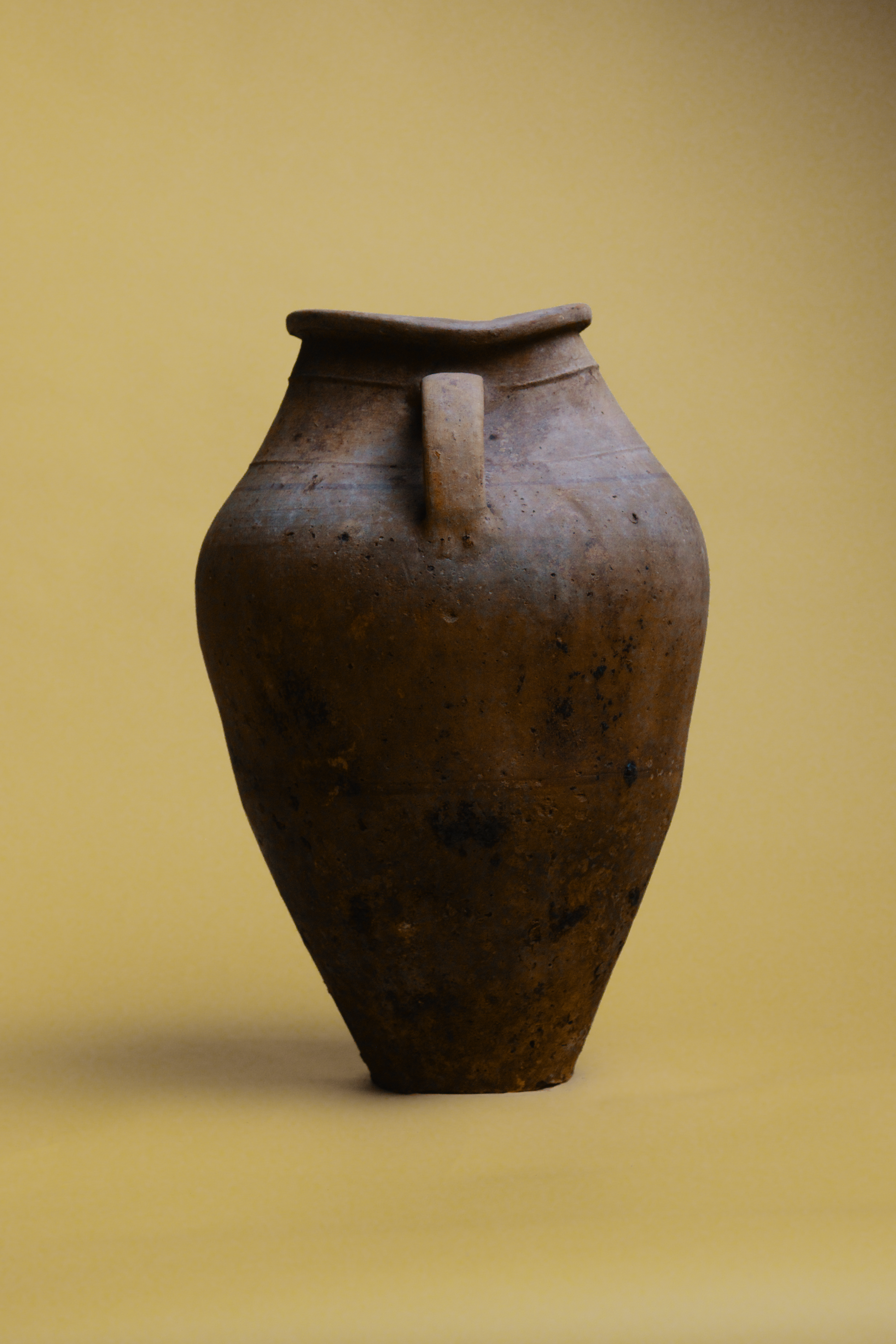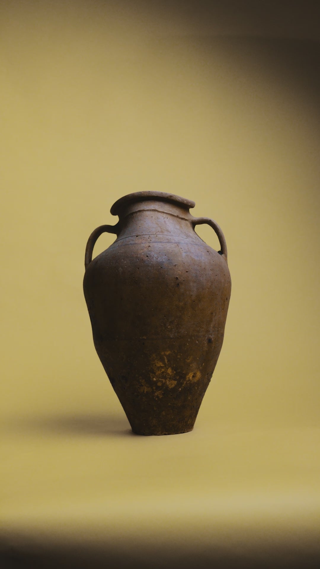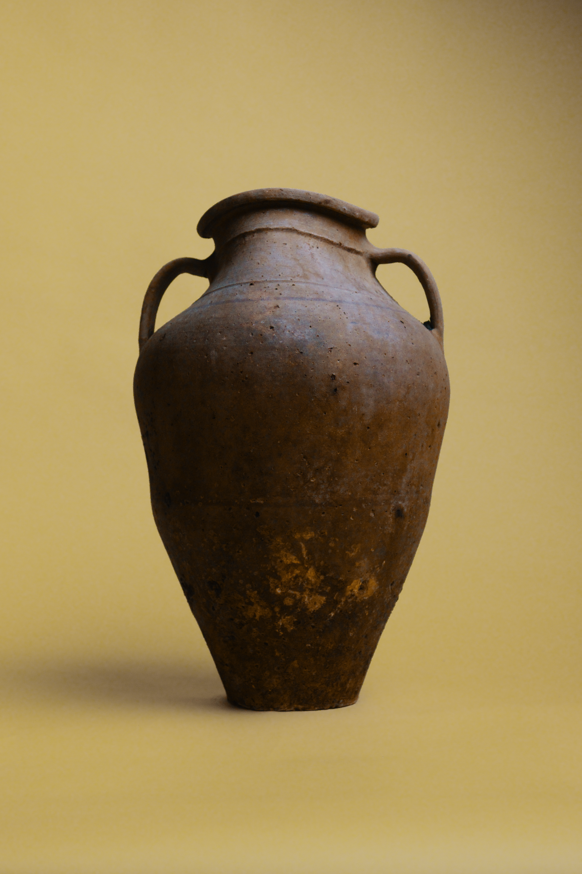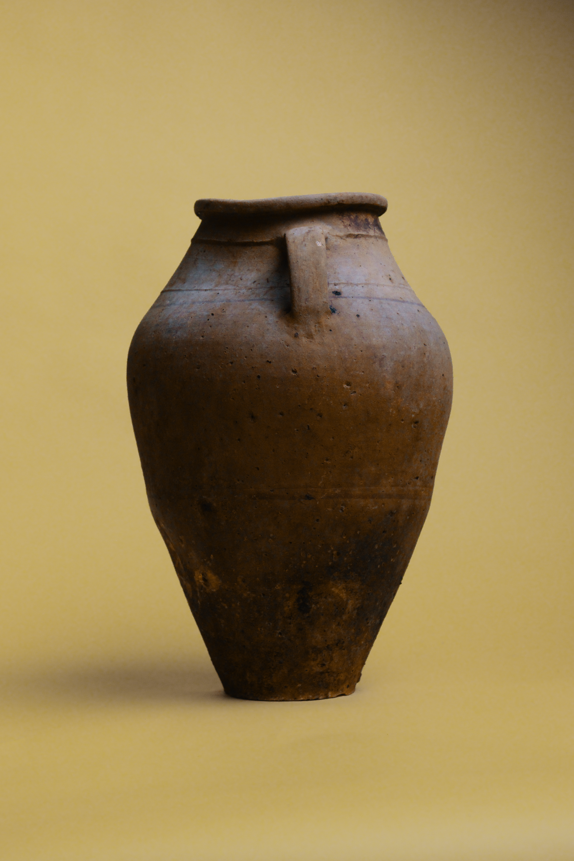 This handcrafted Turkish pot from Antalya was traditionally used to store grains or water. Its large, rounded form, dual handles, and weathered surface reflect the functional beauty of Southern Turkish pottery. The simple yet sturdy design, combined with its rustic ageing, makes it a perfect decorative piece or functional vase in any space.