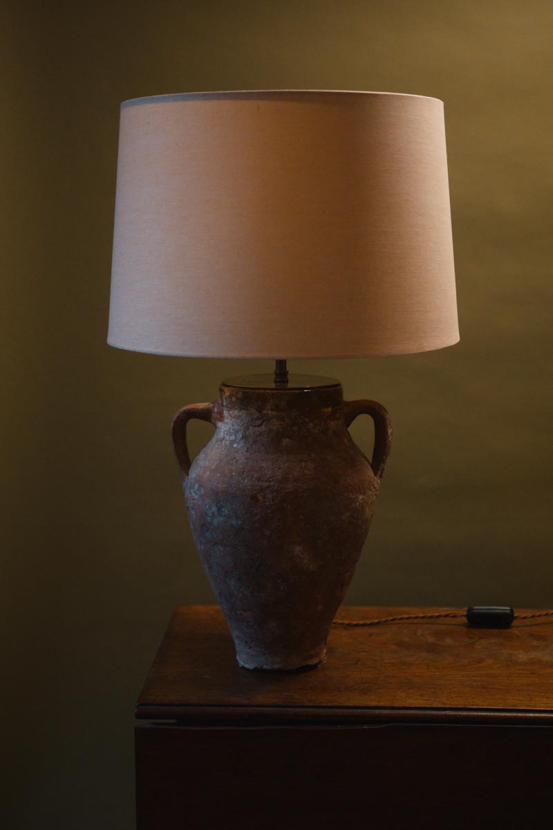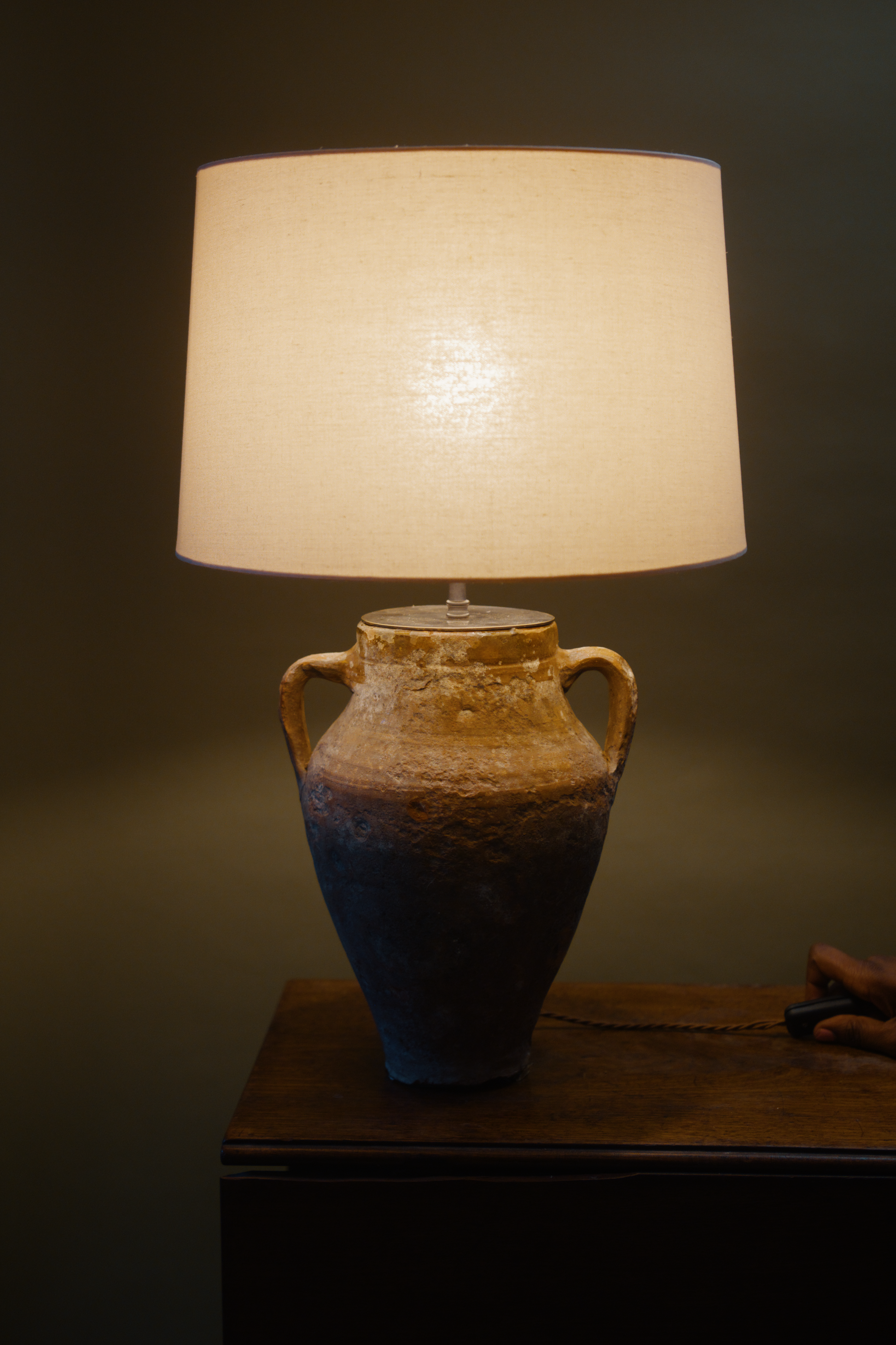 Handcrafted in Turkey’s Western Anatolian region using locally sourced clay, this double-handled pot was traditionally used for storing goods like olive oil. Now expertly converted in the UK into a functional table lamp, its rich patina, glazed rim, and earthy tones bring an authentic, rustic appeal to your space.