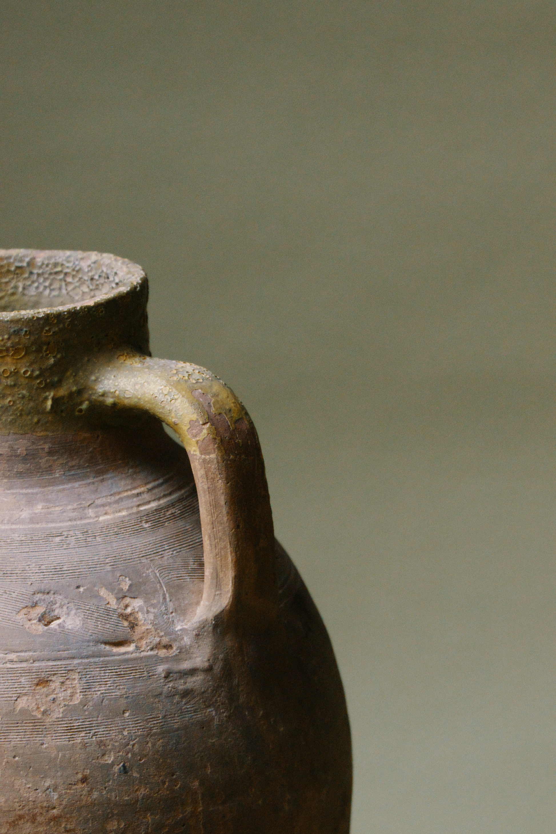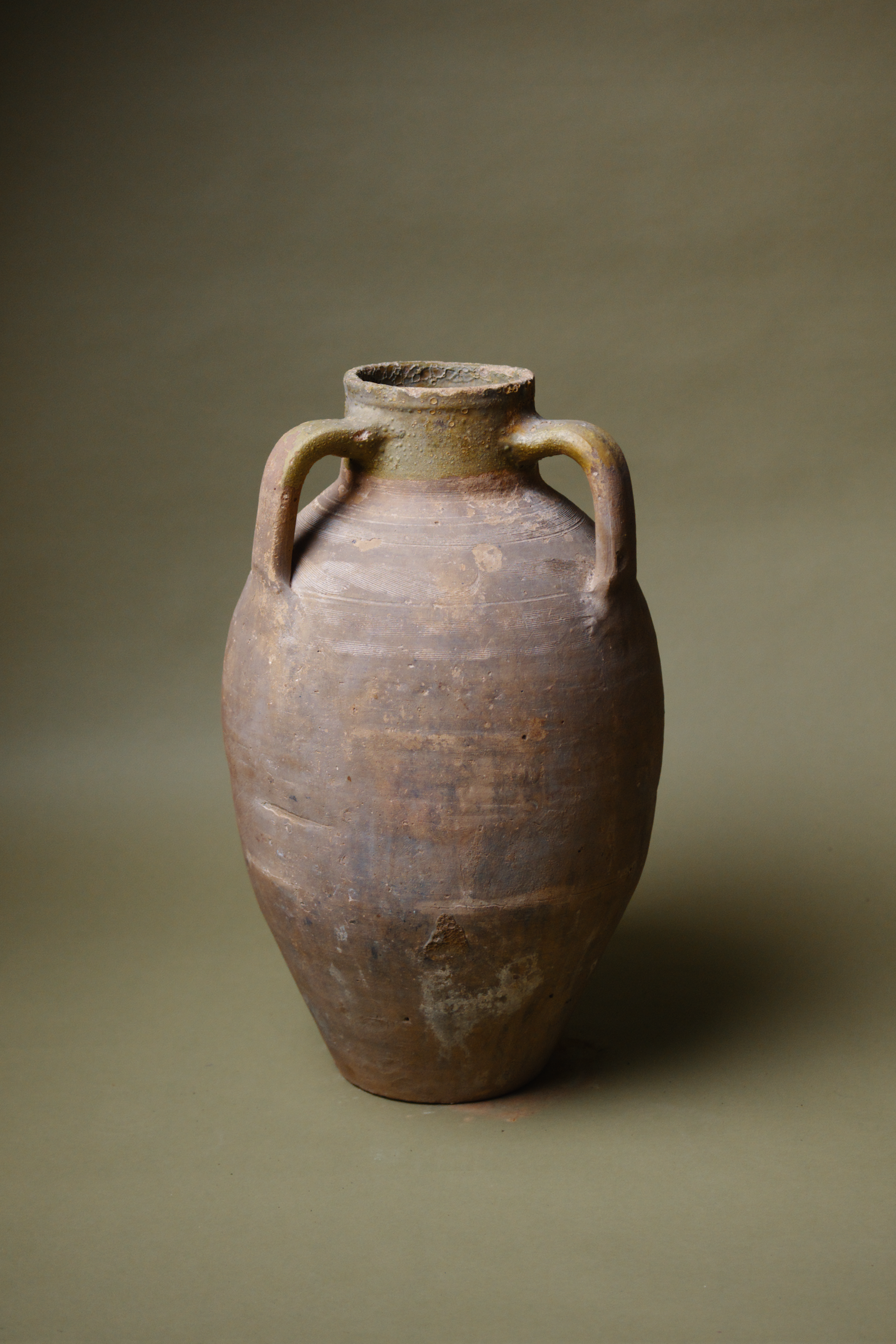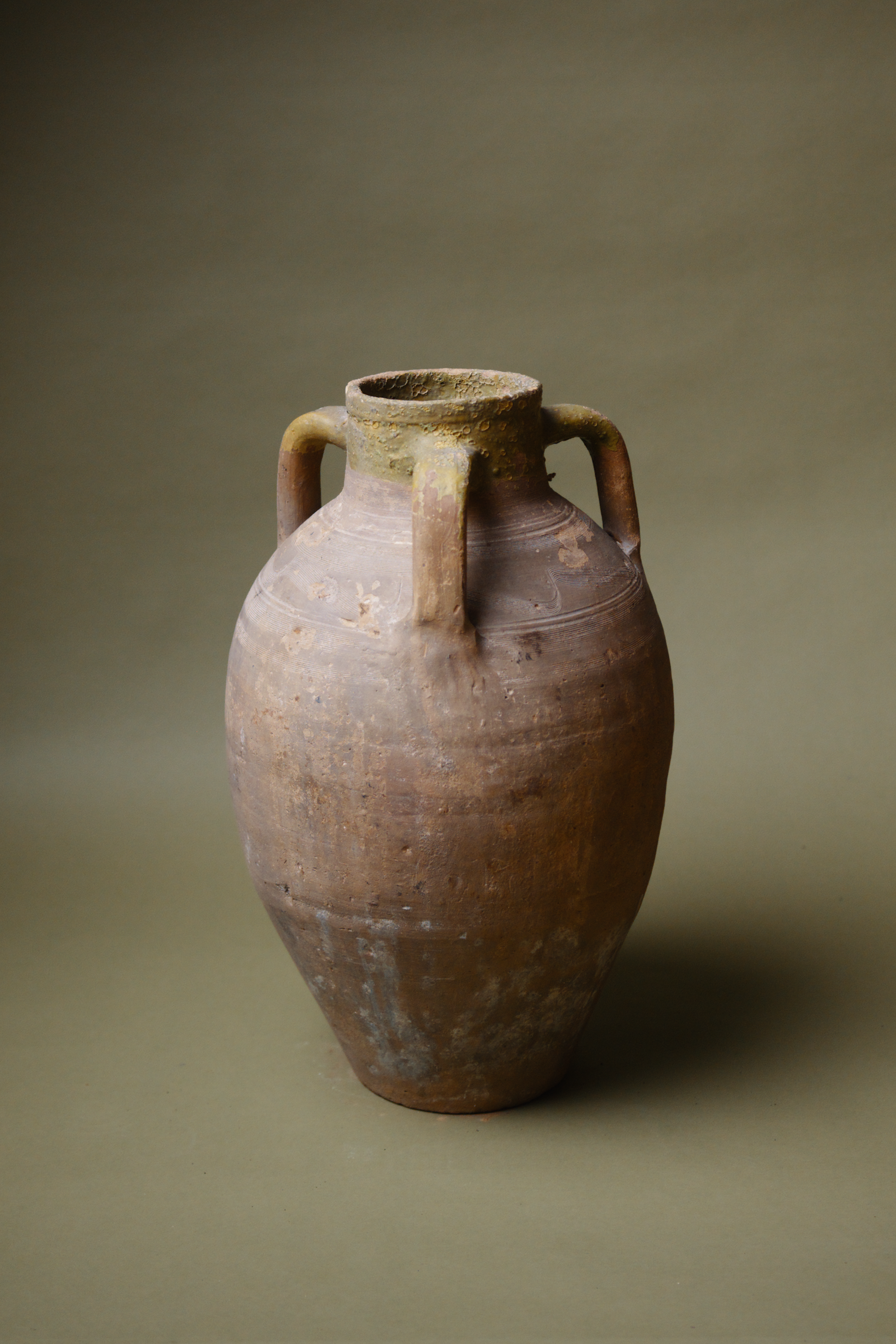 This vintage Turkish amphora features a rare triple-handled design, a testament to its practical origins in Anatolia. Handcrafted from terracotta, its tall, tapered form showcases a natural patina developed over decades of use. The textured surface and subtle earthy tones make this piece a standout for those seeking rustic or Mediterranean decor. Perfect as a decorative vase or as a functional vessel for dried floral arrangements, it adds character and history to cottagecore, farmhouse, or eclectic interiors.