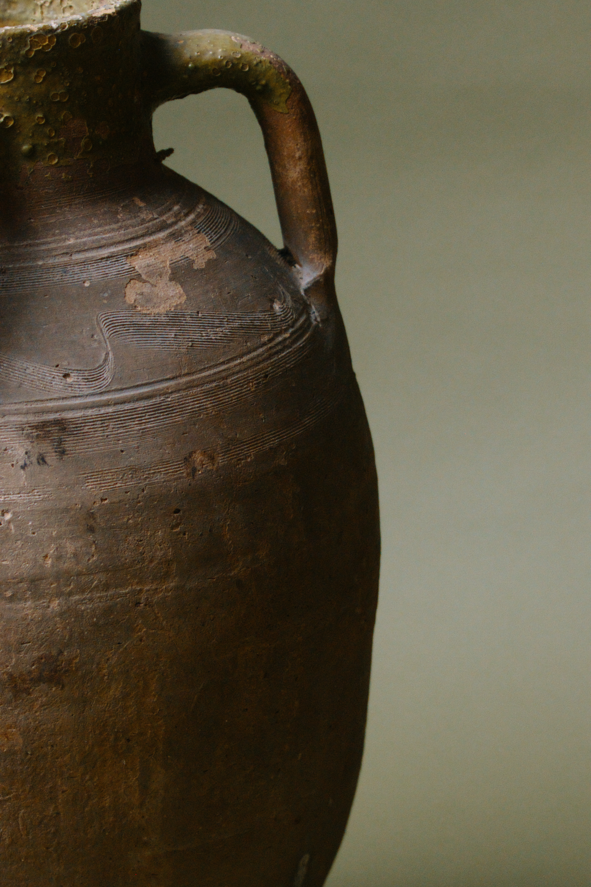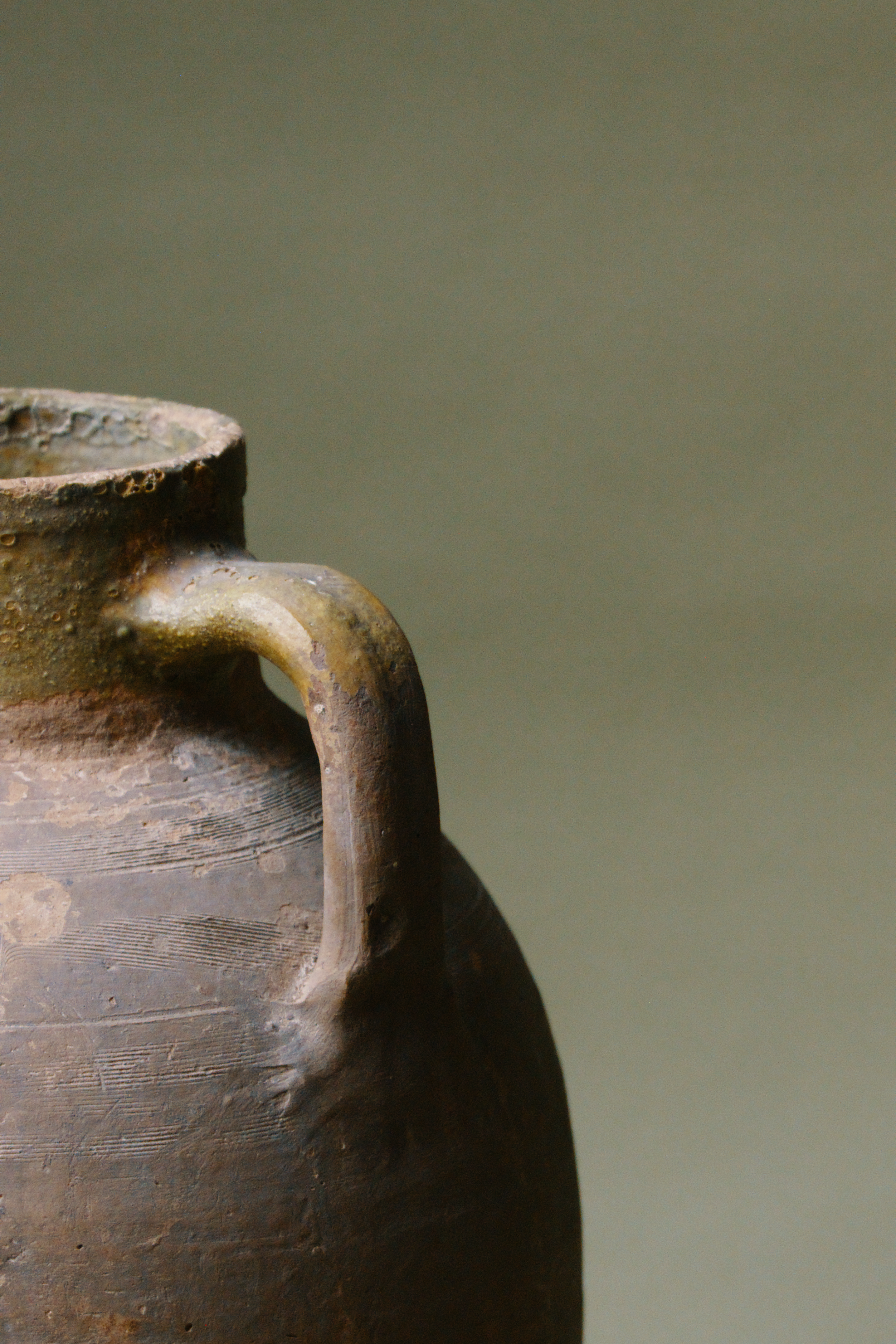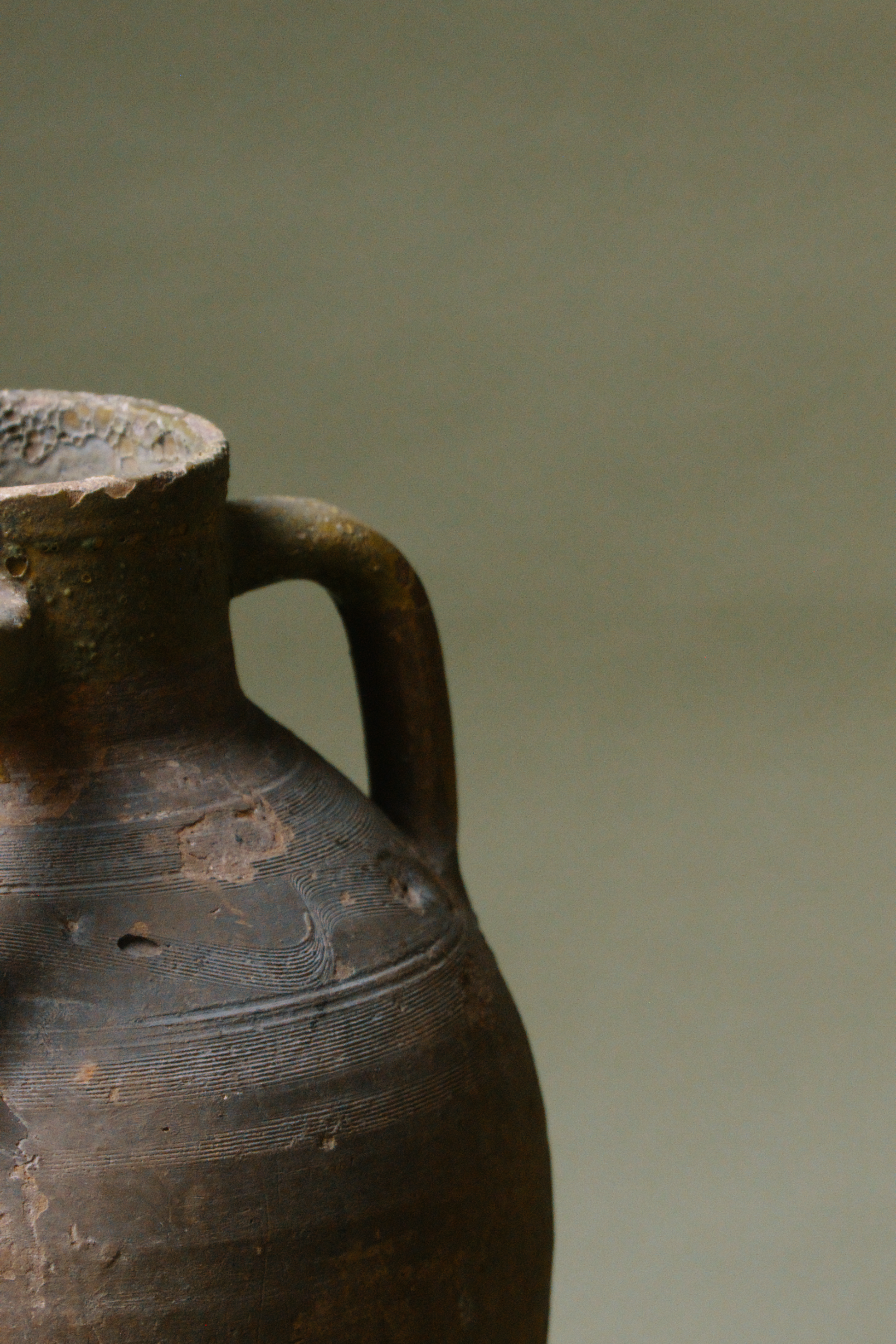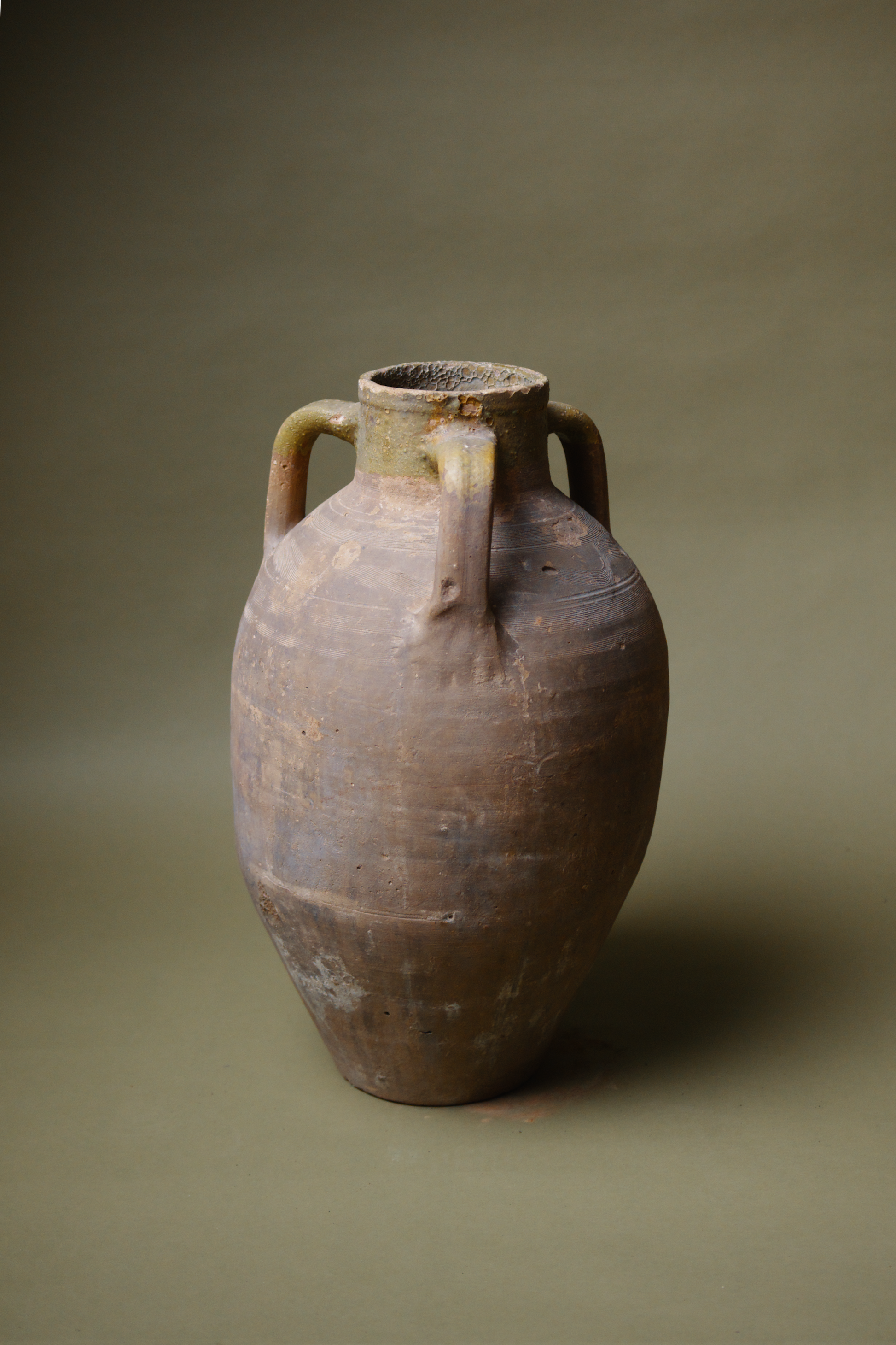This vintage Turkish amphora features a rare triple-handled design, a testament to its practical origins in Anatolia. Handcrafted from terracotta, its tall, tapered form showcases a natural patina developed over decades of use. The textured surface and subtle earthy tones make this piece a standout for those seeking rustic or Mediterranean decor. Perfect as a decorative vase or as a functional vessel for dried floral arrangements, it adds character and history to cottagecore, farmhouse, or eclectic interiors.