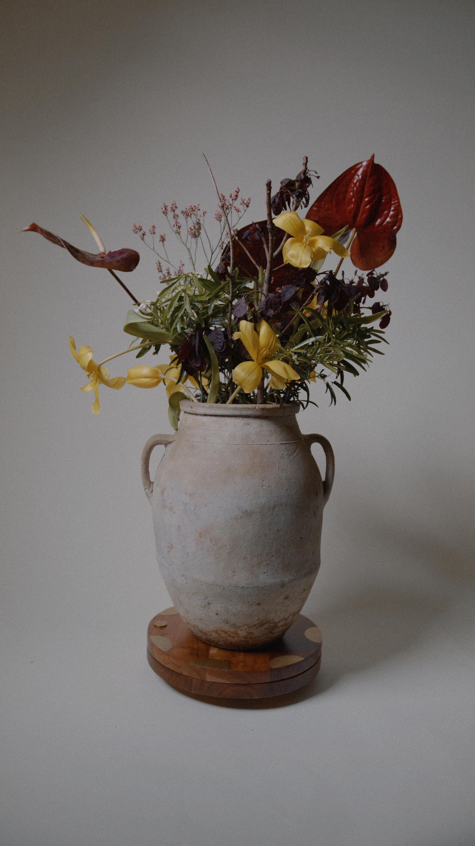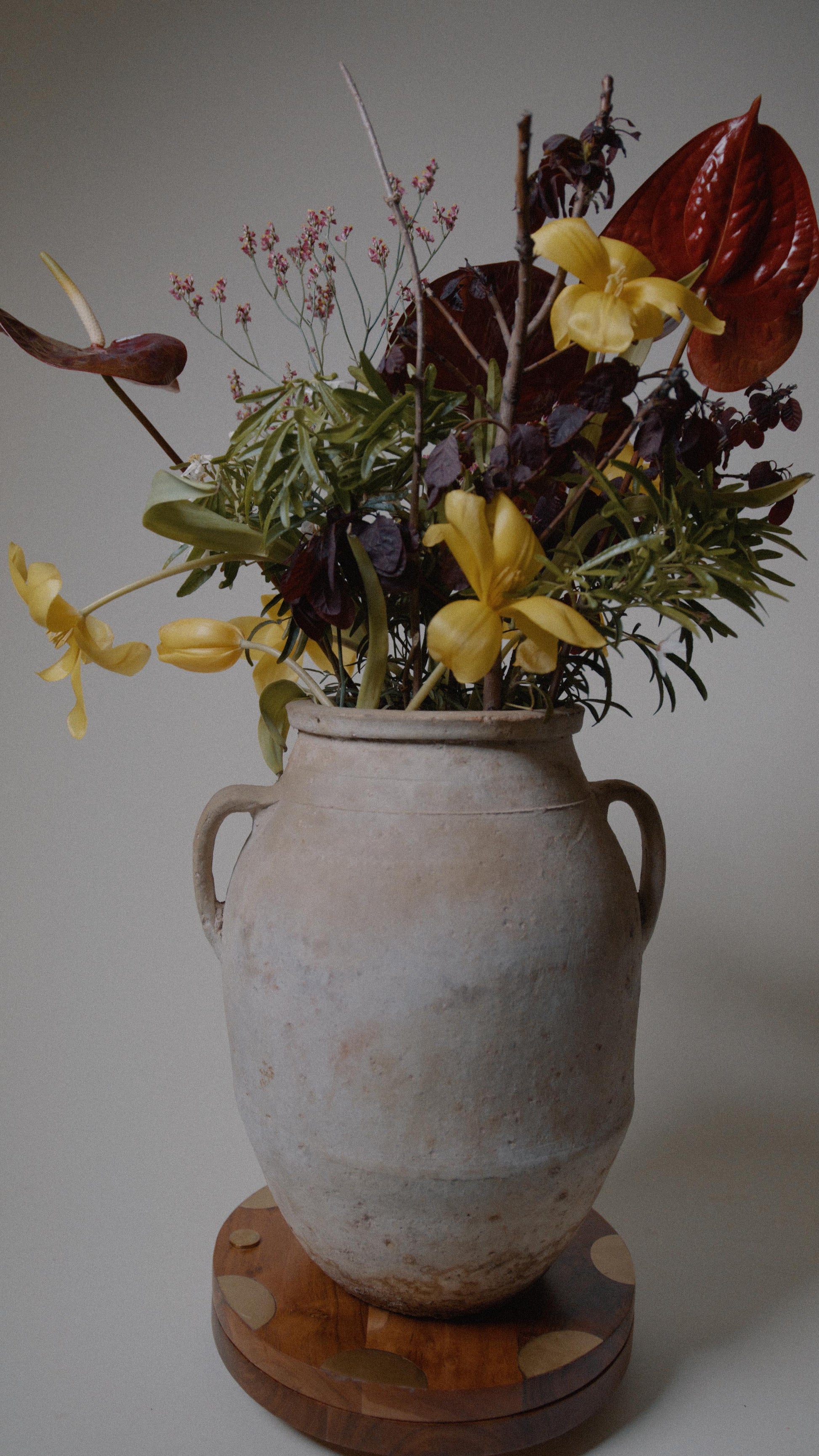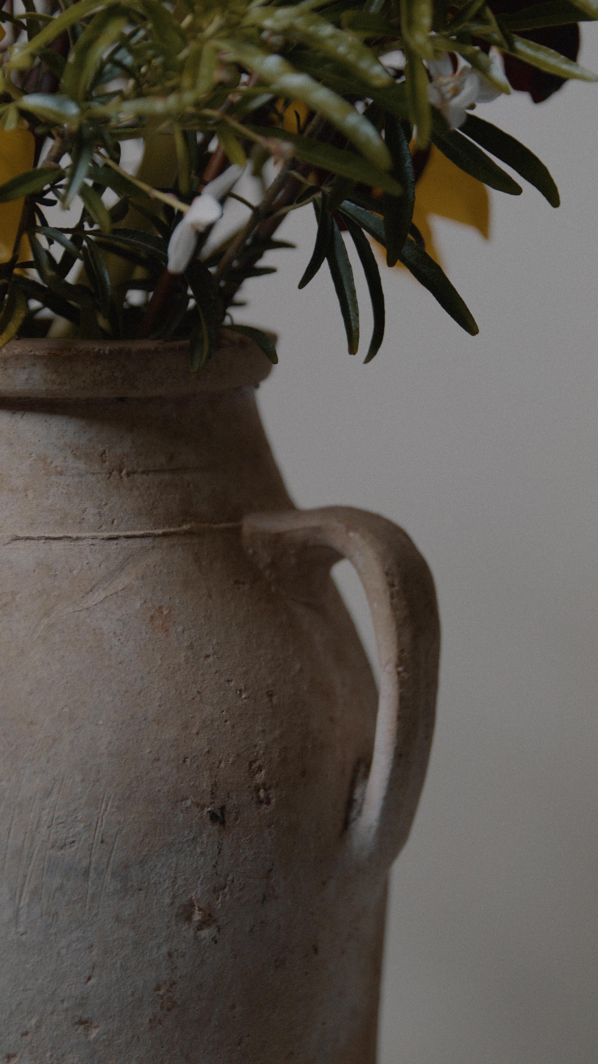 This handcrafted Turkish pot, originating from Konya, once stored essentials like grain and water. The clay's porosity helped keep the contents cool and preserved, which was particularly valuable in the arid climates of central Anatolia. Today, its distinctive form and markings blend tradition with contemporary style, making it a unique vase centrepiece for your space.