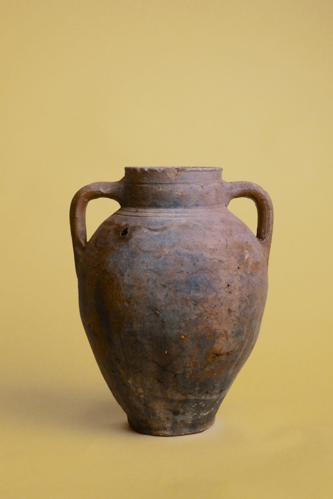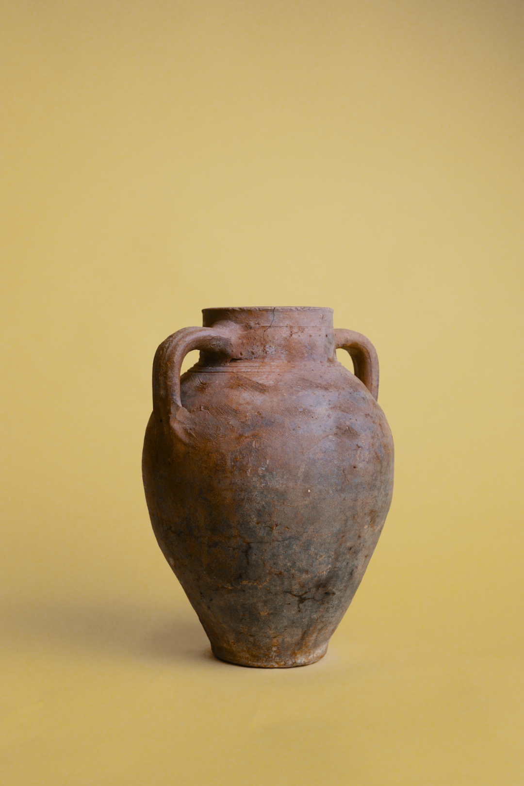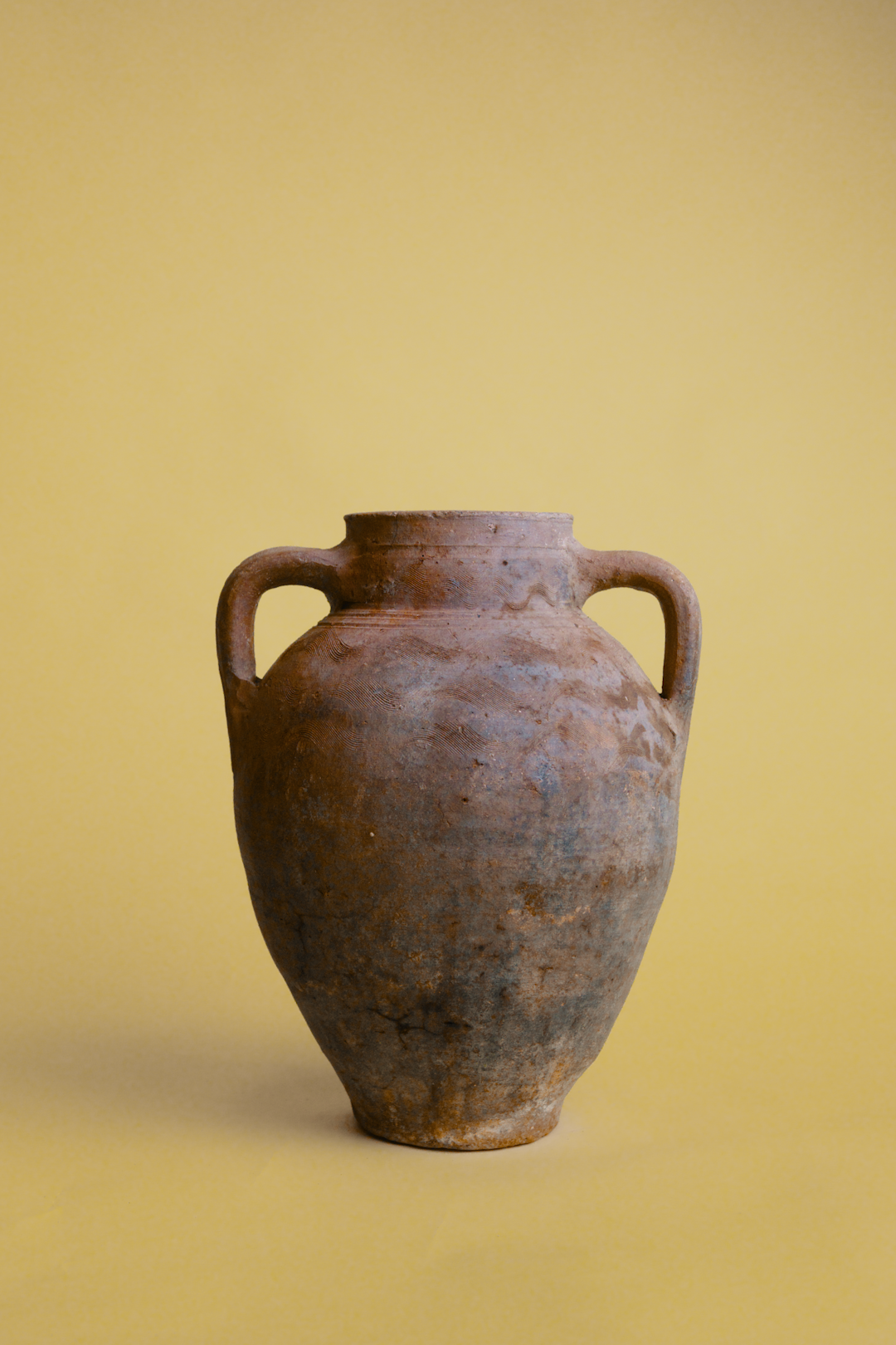 This vintage terracotta pot, with its distinctive double handles, was once used for storing grains and essential goods, reflecting the utilitarian beauty of traditional craftsmanship. The pot's rich earthy tones and textured, weathered surface add a rustic charm, making it an ideal statement piece for farmhouse, cottage, or country-style interiors. Its aged patina and slight imperfections bring a touch of authentic history, connecting your space to a timeless past.