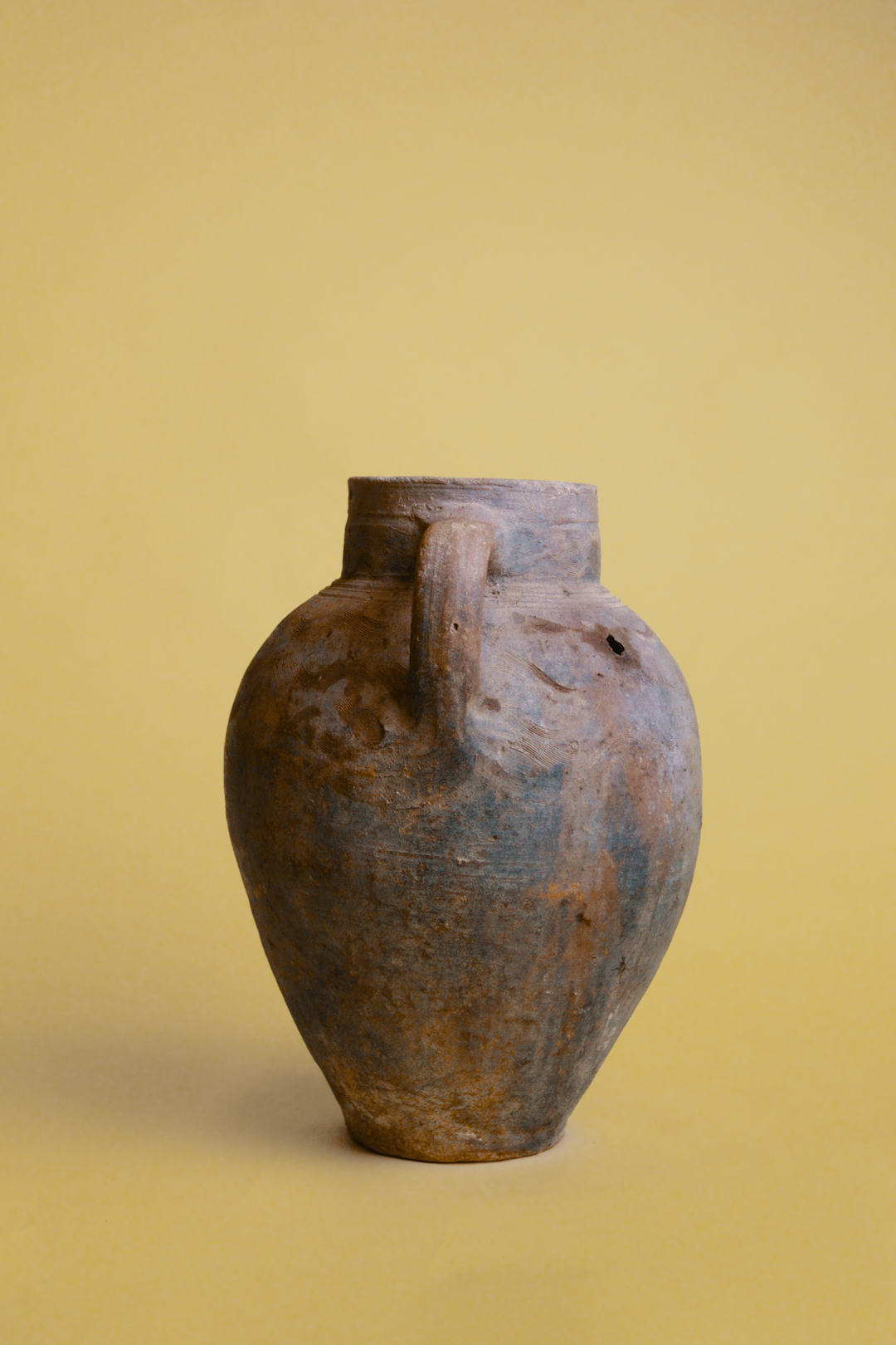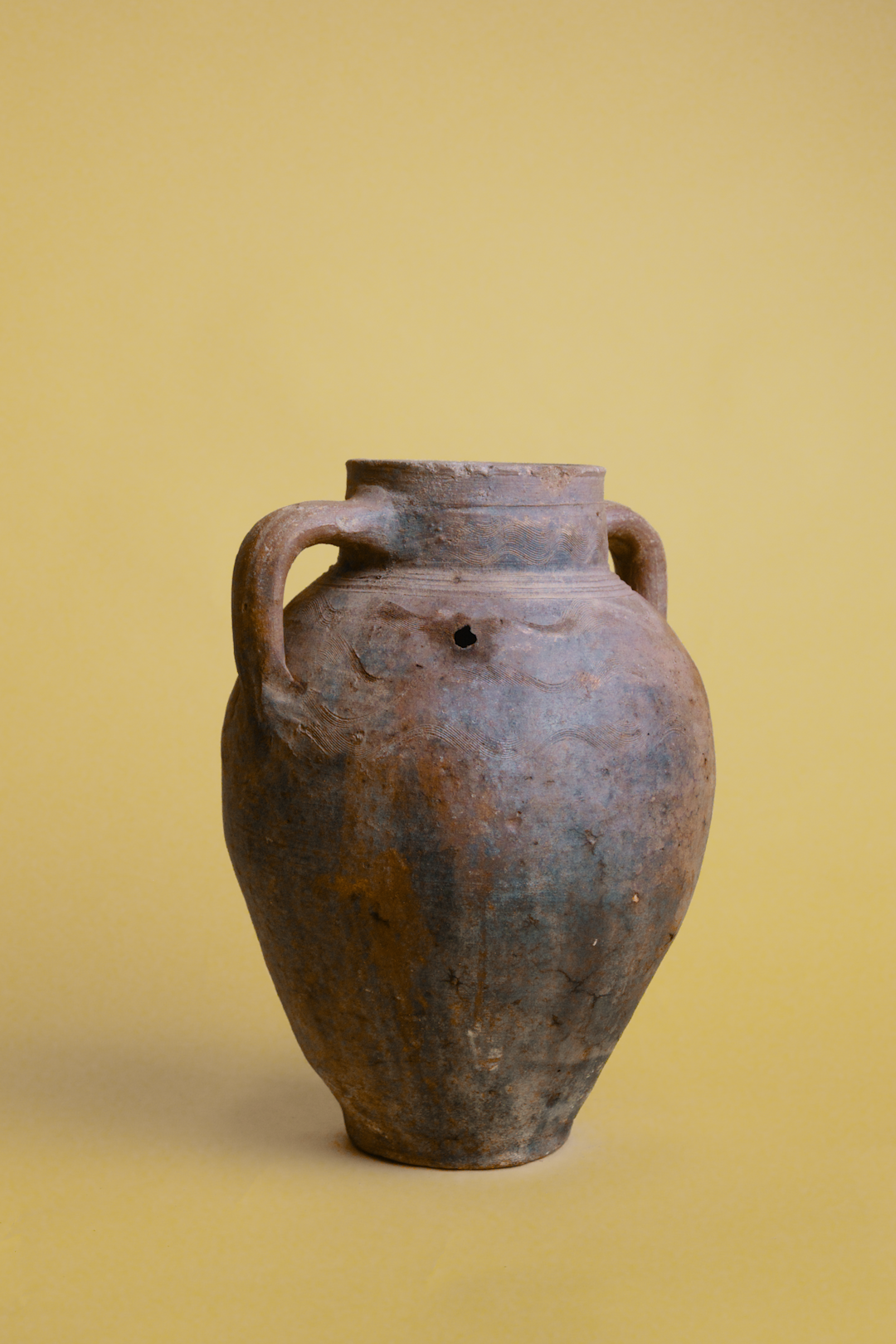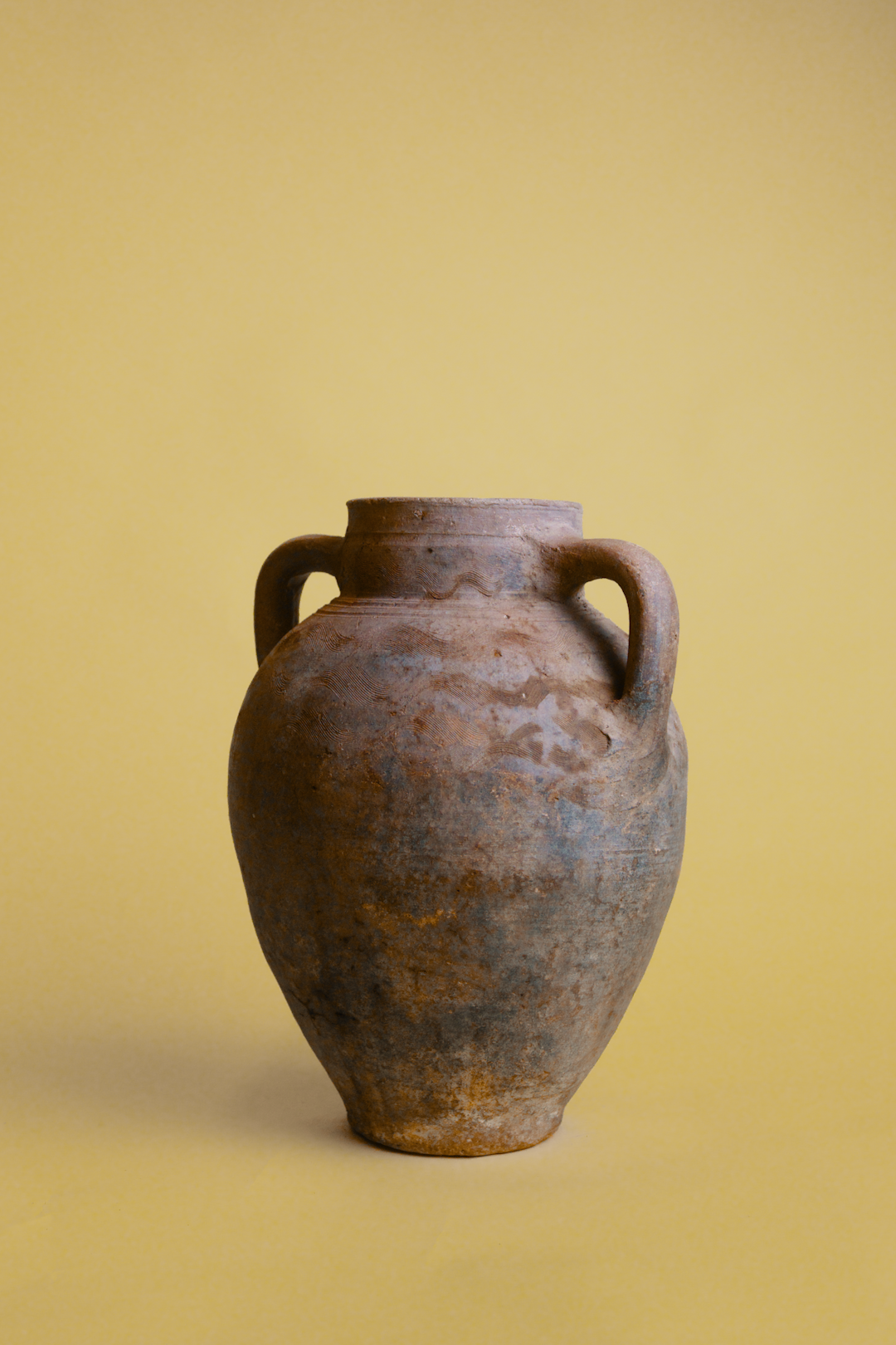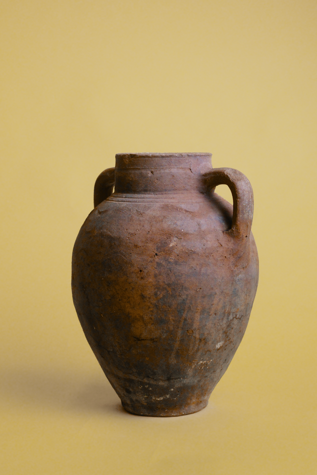 This vintage terracotta pot, with its distinctive double handles, was once used for storing grains and essential goods, reflecting the utilitarian beauty of traditional craftsmanship. The pot's rich earthy tones and textured, weathered surface add a rustic charm, making it an ideal statement piece for farmhouse, cottage, or country-style interiors. Its aged patina and slight imperfections bring a touch of authentic history, connecting your space to a timeless past.
